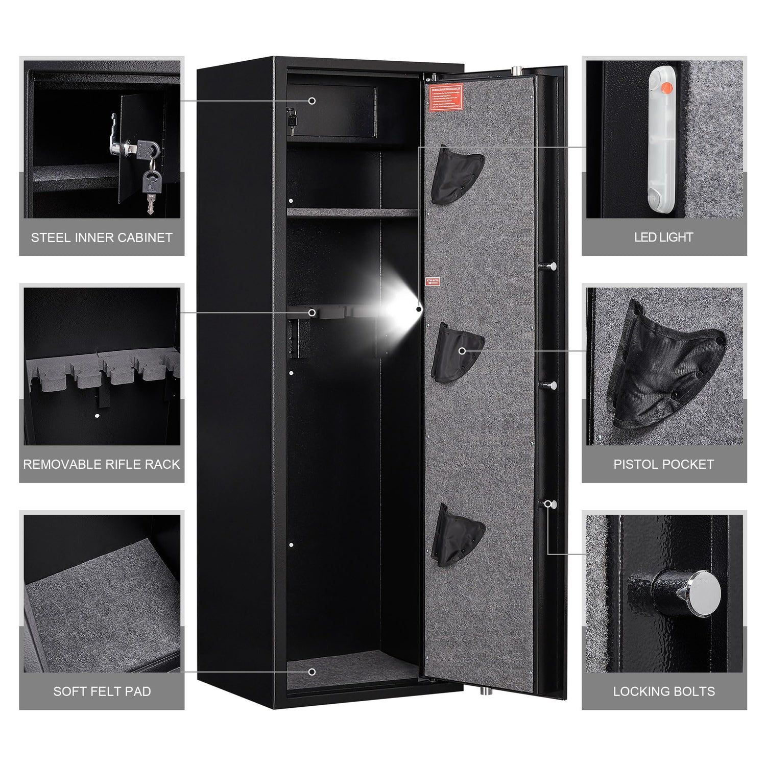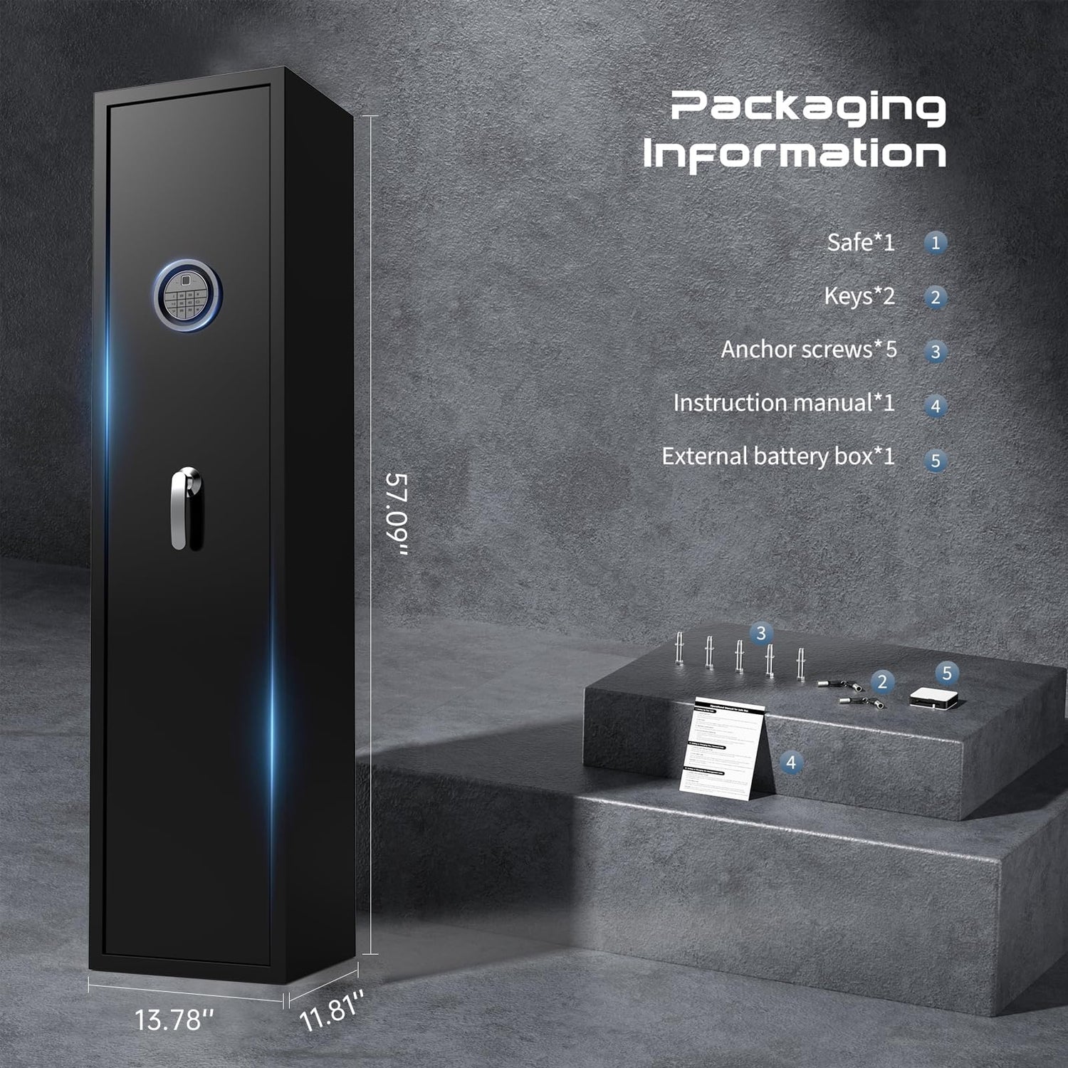 - š„The outer box size of rifle gun safe is 57*13*11", which can hold 5 rifles at most. When the height of all rifles is less than 49", the storage shelf can be installed for storage Bullets, magazines and other accessories. There is also a separate small lock box inside. The key of the small lock box is separate from the key of the gun safe, Other valuables can be stored.