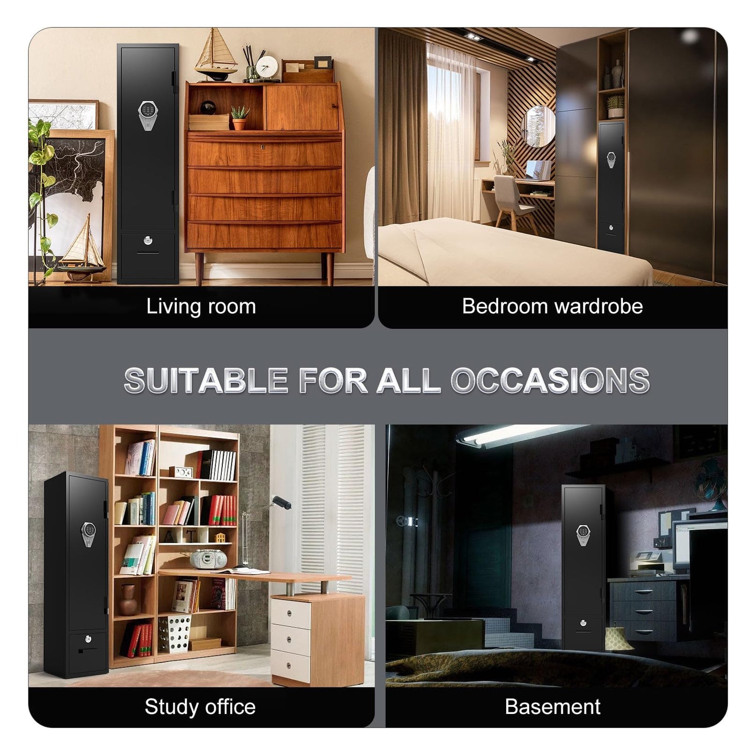 - 🔥【MORE SUITABLE FOR HOME/OFFICE USE】 Dimensions are set up more reasonably compared to similar products, can be placed in your home or office for 2-3 rifles and 4 handguns, 2 gun racks can be adjusted up and down for storing long and short guns, no assembly required, more convenient compared to other gun safes, Holes are pre-punched in the back of the gun cabinet and come with the hardware needed for wall mounting.