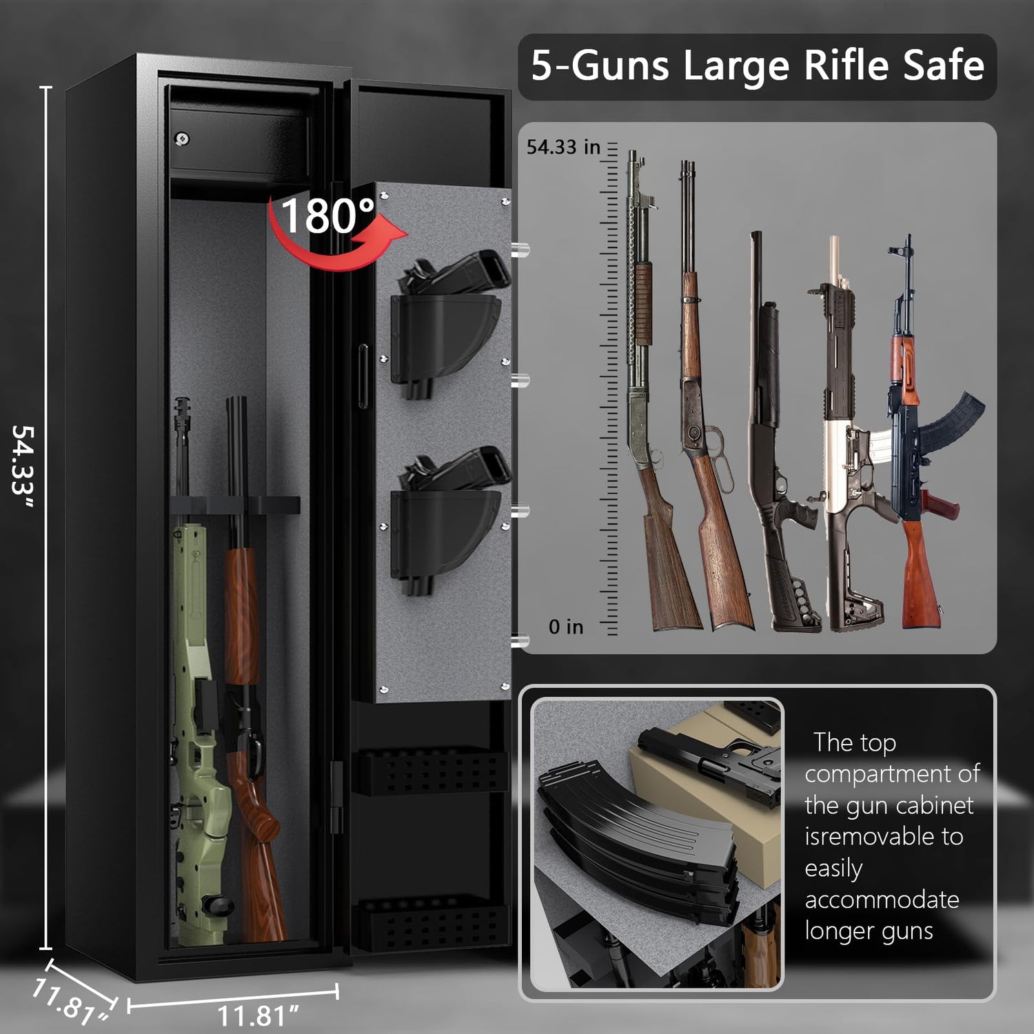 - [6 Rifle Safe] Gun Safe Exterior Dimensions (inches): H 54.33xW 11.81xD 11.81in Large Capacity Gun Safe. Our rifle safe can store up to three long guns up to 53.5 inches long with the shelves removed, and the soft velvet interior protects your firearms from scratches. it is a home rifle and handgun gun safe for shotguns, long guns, shotguns, rifles, handguns, and other various sizes of firearms. and other various sizes of firearms.