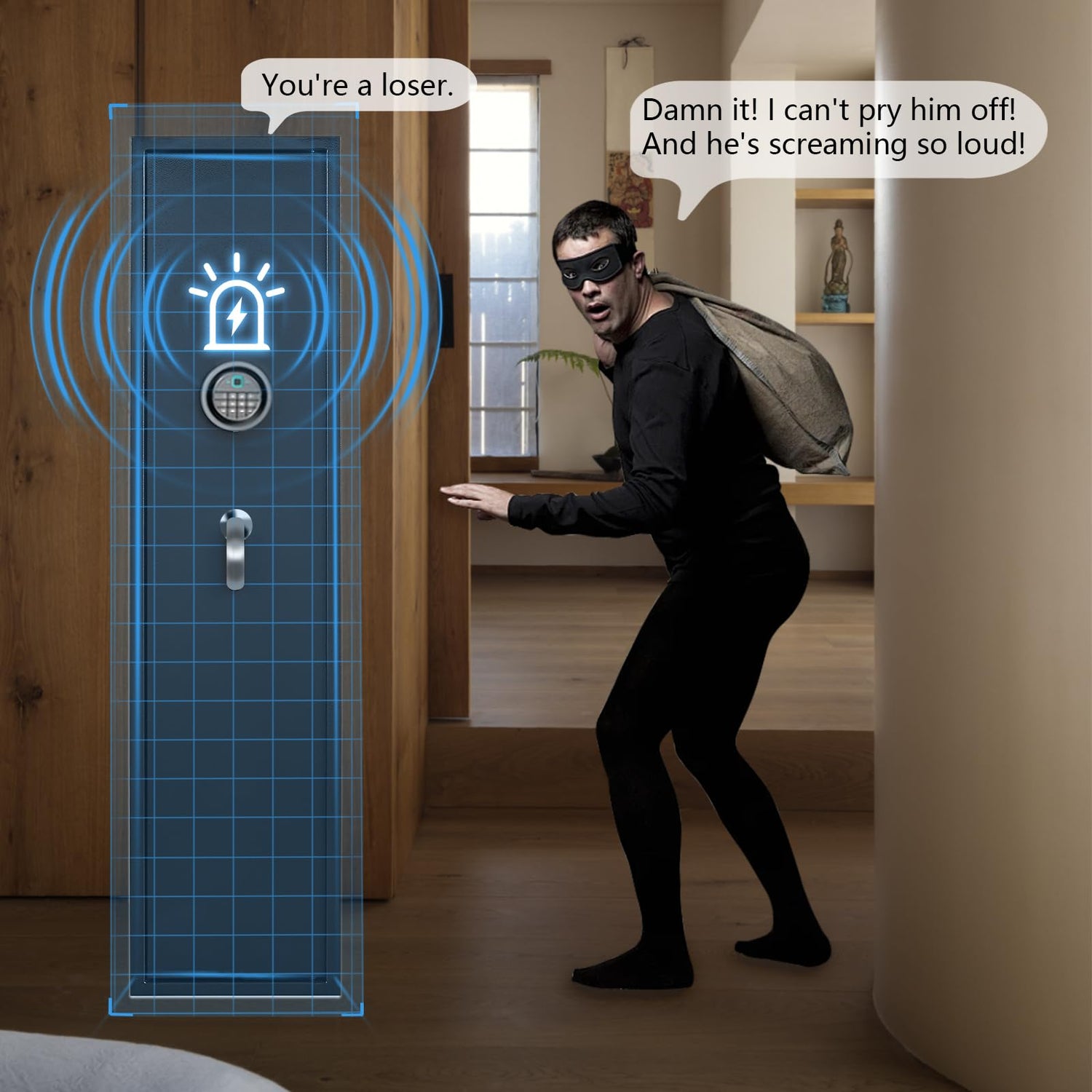- Wrong Password Alarm, Induction Alarm, Silent Mode: If you enter the wrong password three times in a row, the Gun Safe will automatically alarm. If the thief tries to move the gun safe, the gun safe will sound an inductive alarm. The double alarm system increases the security factor and protects your guns in all aspects. If you don't want the gun safe to sound, you can activate the silent mode.
