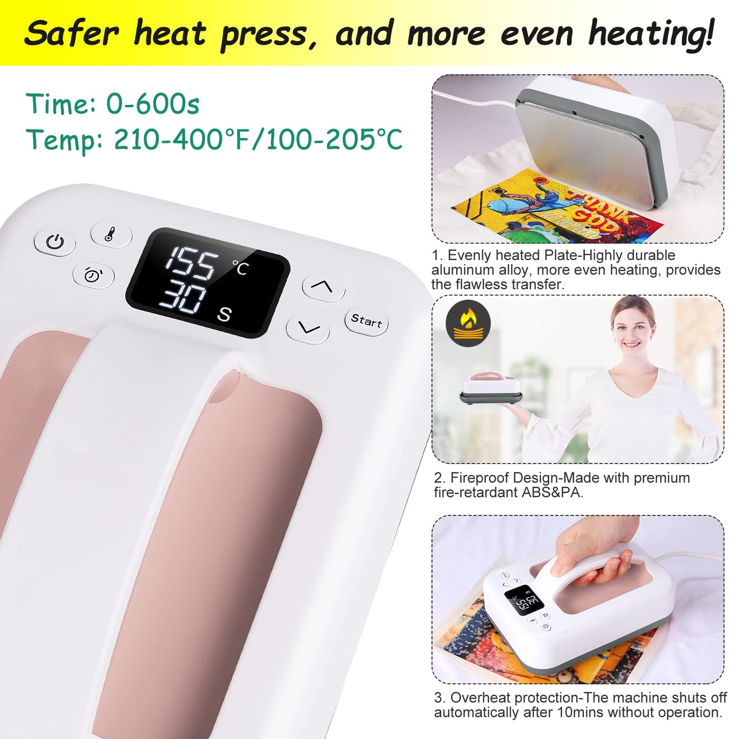 - 【Perfect size and durable】Our small heat press are 7×4.8inch, perfect for different sizes of clothes, and patterns twice as big as the heat press can be easily transferred. You can make shirts for everyone, whether children or adults, store operations, or home use. This mini heat press is small in size and light in weight, which is very convenient to store and carry. It's the best gift for your family.
