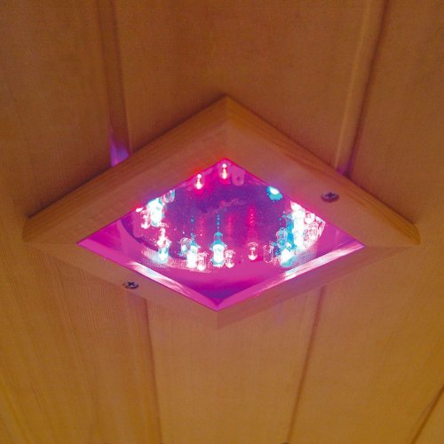 Experience the health benefits of FAR infrared heating in your own home Backed by CE, CETL, RoHS and ISO 9001 certifications: internationally-recognized seals of quality, safety, and professional manufacturing. Canadian Hemlock construction insulates heat and resists warping 5 ceramic, infrared heaters provide pain relief for sore muscles and joints Chromotherapy lighting system relieves anxiety Integrated sound system with aux inputs, radio, and CD player Adjustable roof vents bring in outside air Simple-to-operate LED control panel Bronze-tinted tempered glass Oxygen ionizer Requires 120v / 15amp power Seats up to two adults 1600 watts provide heat up to 141 degrees F 7-year limited warranty on wood structure, 5-year heating & electronics, 1-year radio