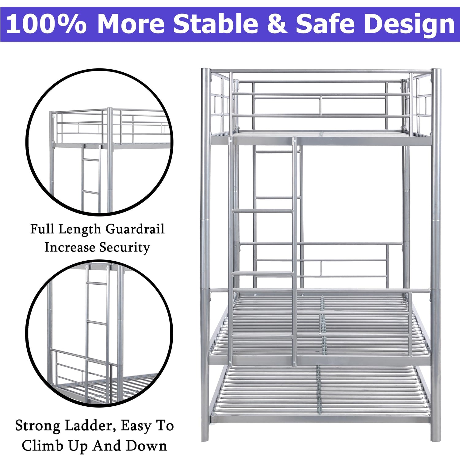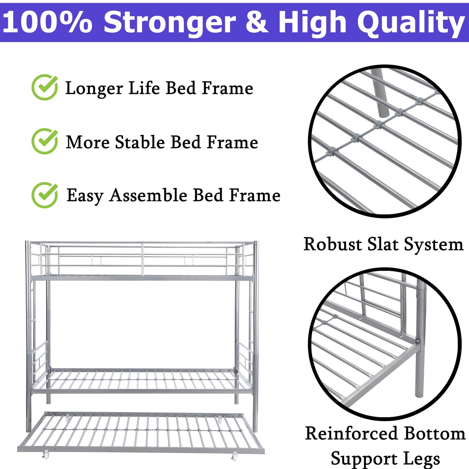 Heavy Duty Metal Bunk Bed Twin Over Twin for Kids Adults, Modern Twin Over Twin Bunk Bed with Trundle, Latest Version Twin Size Bunk Beds Frame, Convertible Bunkbed with Safety Guard Rails (Silver)