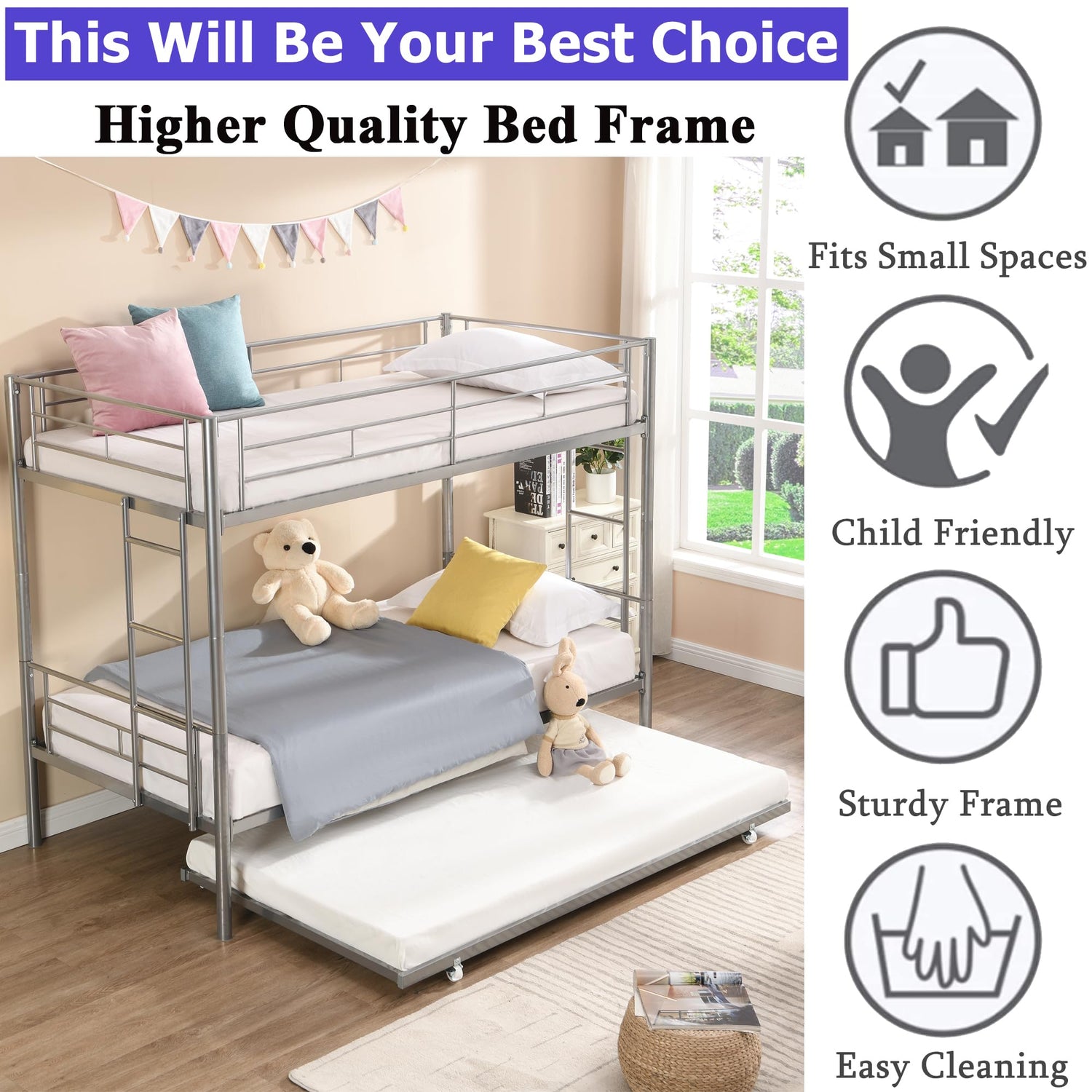 Details: 【High Quality Twin Size Bunk Bed】--- This high quality product is made of high quality metal. Compared with similar products have better sturdiness and durability. The weight capacity of the upper bed is 450lbs. the weight capacity of the lower bed is 450lbs. the weight capacity of the trundle bed is 450lbs. the weight capacity of the upper bed is 450lbs. the weight capacity of the lower bed is 450lbs. 【Multifunctional 3 In 1 Bed】--- This latest version of bunk bed comes with a trundle. you can sleep 3 people on the bunk bed at once. trundle bed has universal wheels at the bottom for better pull out and pull in. The recommended mattress thickness is 6 -8inches. (Please note that the mattress is not included) 【Convertible Bunk Bed】---- This high quality bunk bed can be converted into 2 separate twin size bunk beds. If you have guests you can convert the bunk bed into 2 separate bunk beds. You can sleep 3 people on our twin over twin bunk bed with trundle. 【No Box Spring Needed】--- High quality twin over twin bunk bed does not need a box spring. The twin over twin bunk bed features a sturdy slat system. (22+22+20) can support the mattress perfectly and give the mattress get enough ventilation. Product size: 77.2 x 41.3 x 65" (LxWxH. Our products have detailed assembly instructions and assembly tools, you can finish assembling the bunk bed according to our instructions and tools. 【Modern Style Design】--- This bunk bed can give you more space in a limited space. The bunk bed is designed in modern style, the black unique style can perfectly match your bedroom style. Report an issue with this product or seller