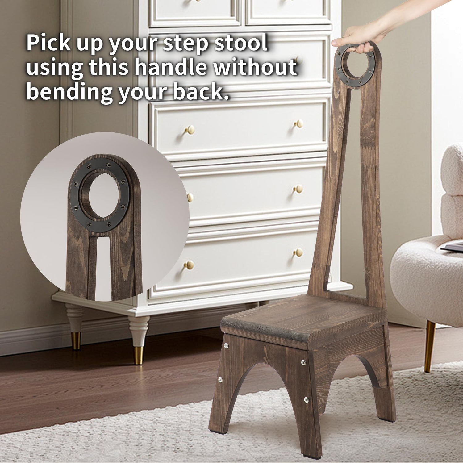 Details: Are you tired of struggling to reach high shelves or cabinets? Say goodbye to bending your back to pick up the wood step stool.