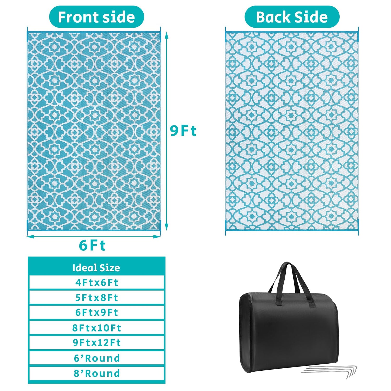 - XL Large Reversible Outdoor Rugs: Featuring a classic moroccan pattern on both sides, this rectangular 6x9 ft outdoor area rug allows you to instantly refresh your patio, porch, backyard, deck, RV campsite. And this outdoor deck rug is reversible, two-sided design allows you to have two different looks,both sides can blend perfectly with nature and look very full and comfortable.