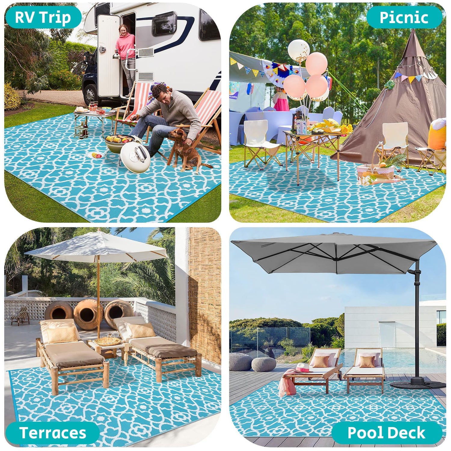 - Versatile Outdoor Carpet: The indoor outdoor plastic rugs have multiple choice in different colors(4'x6',5'x8',6'x9',8'x10',9'x12',9'x18',8'round), is ideal for a variety of indoor outdoor activities,like patio mat, deck rug, garden rug, beach mat, picnic mat, BBQ party mat, rv camping rug,pool rug,outdoor doormat,garage rug,front door mat,allowing you to have plenty of imaginable space for more fun.