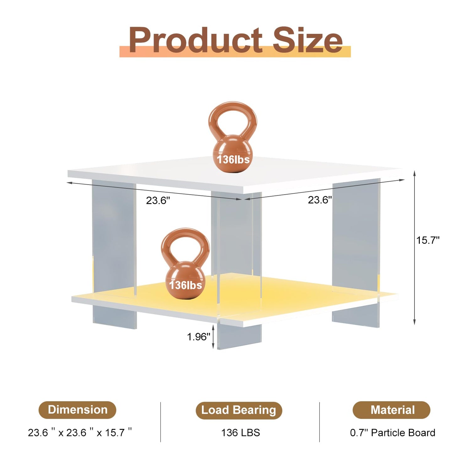 - 【2-Tier Ample Storage】The coffee table suitable for small spaces, features a roomy tabletop and open lower shelves for storage, with side acrylic panels to prevent items from falling. Away from the chaos to keep the room tidy. The decent size: 23.6"(L) x 23.6"(D) x 15.7"(H) .