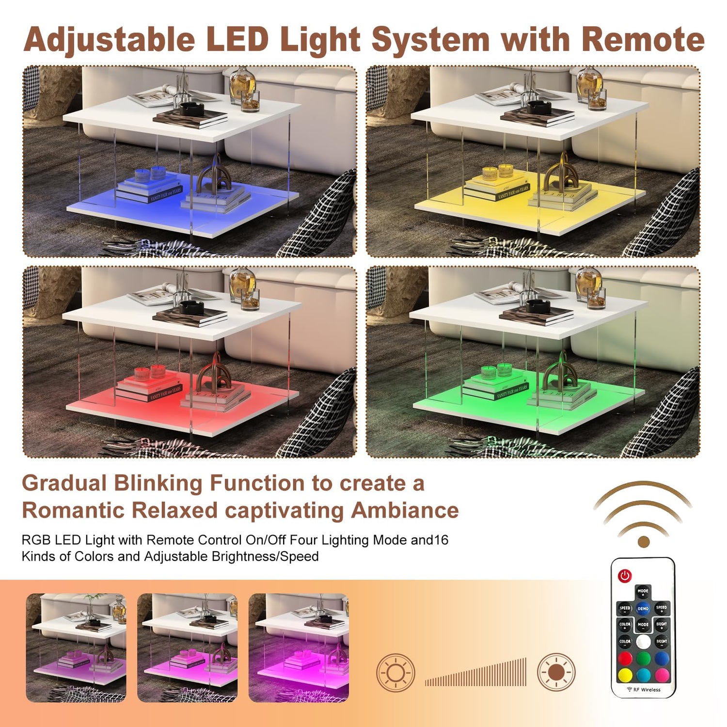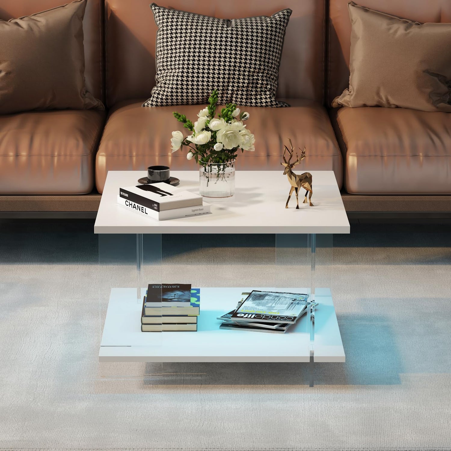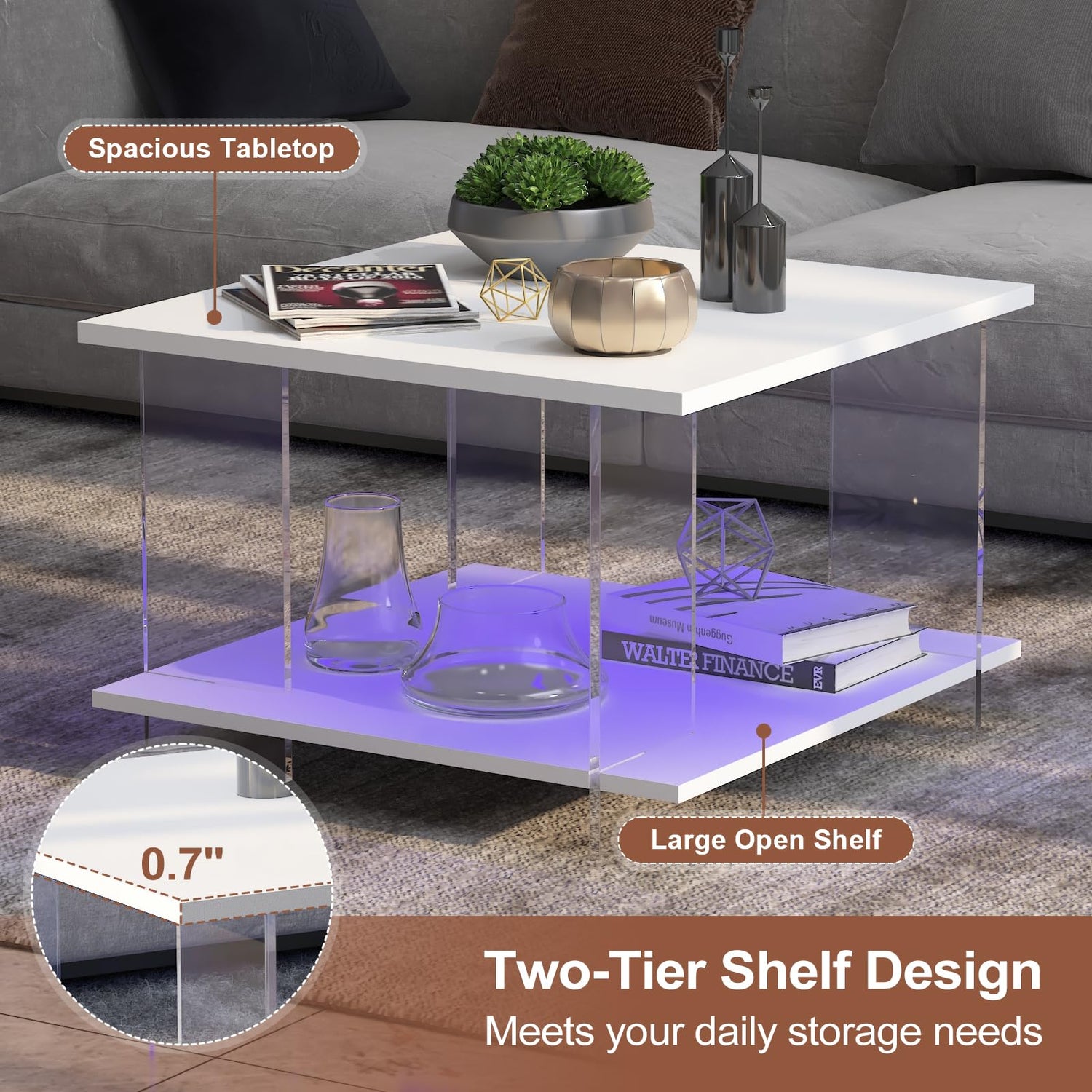 HedoAjim 24" Acrylic Coffee Table with White Wood Tabletop, Minimalist Stylish Modern Square Center Table for Living Room,Led Living Room Table with Storage Shelf & Acrylic Frame for Small Space