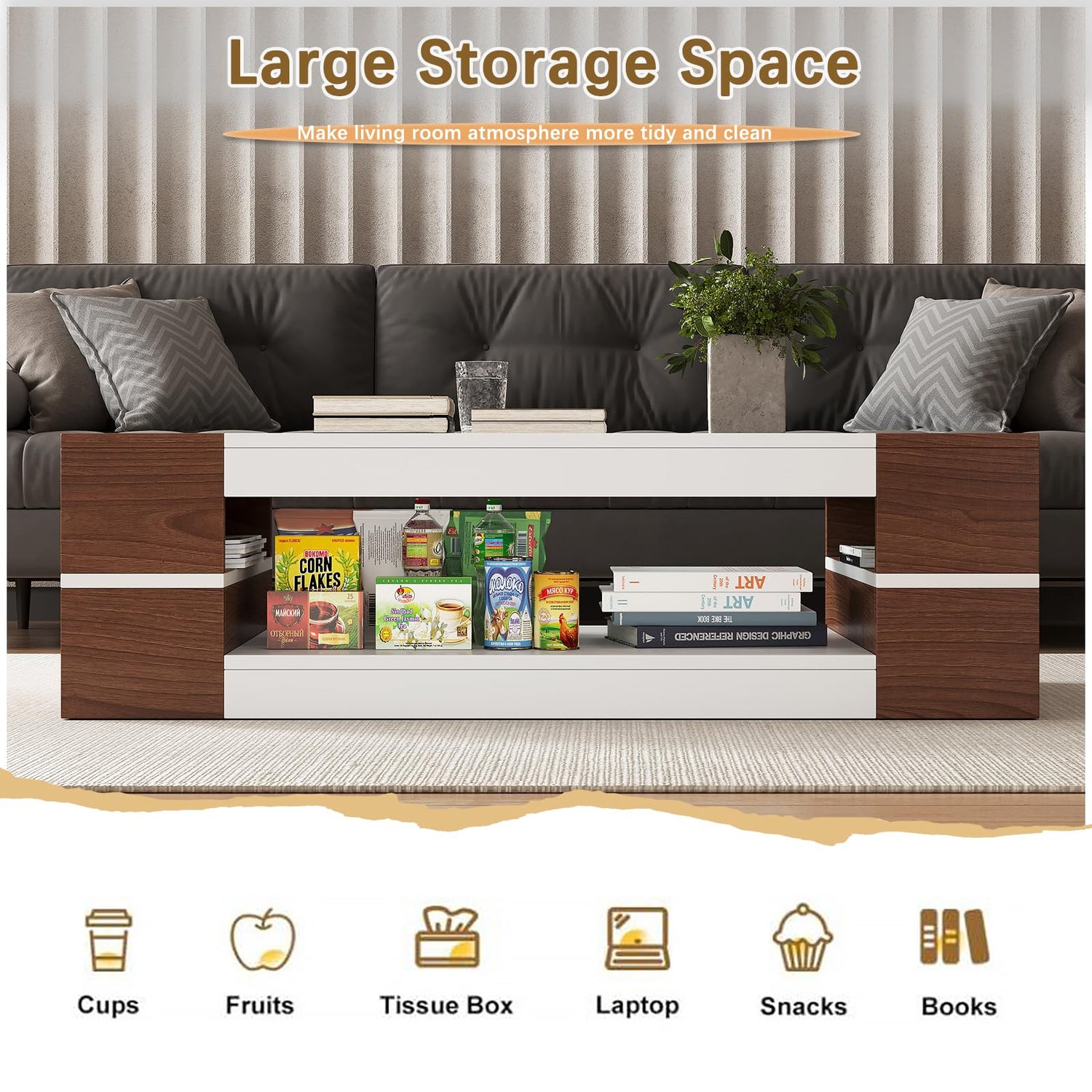 HedoAjim 47.2" Modern Stylish Coffee Table with Glass Table Top, Large Living Room Table Rectangular 2-Tier Center Tables with Storage, Wood Cocktail Tea Tables for Dining Reception Room, White Walnut