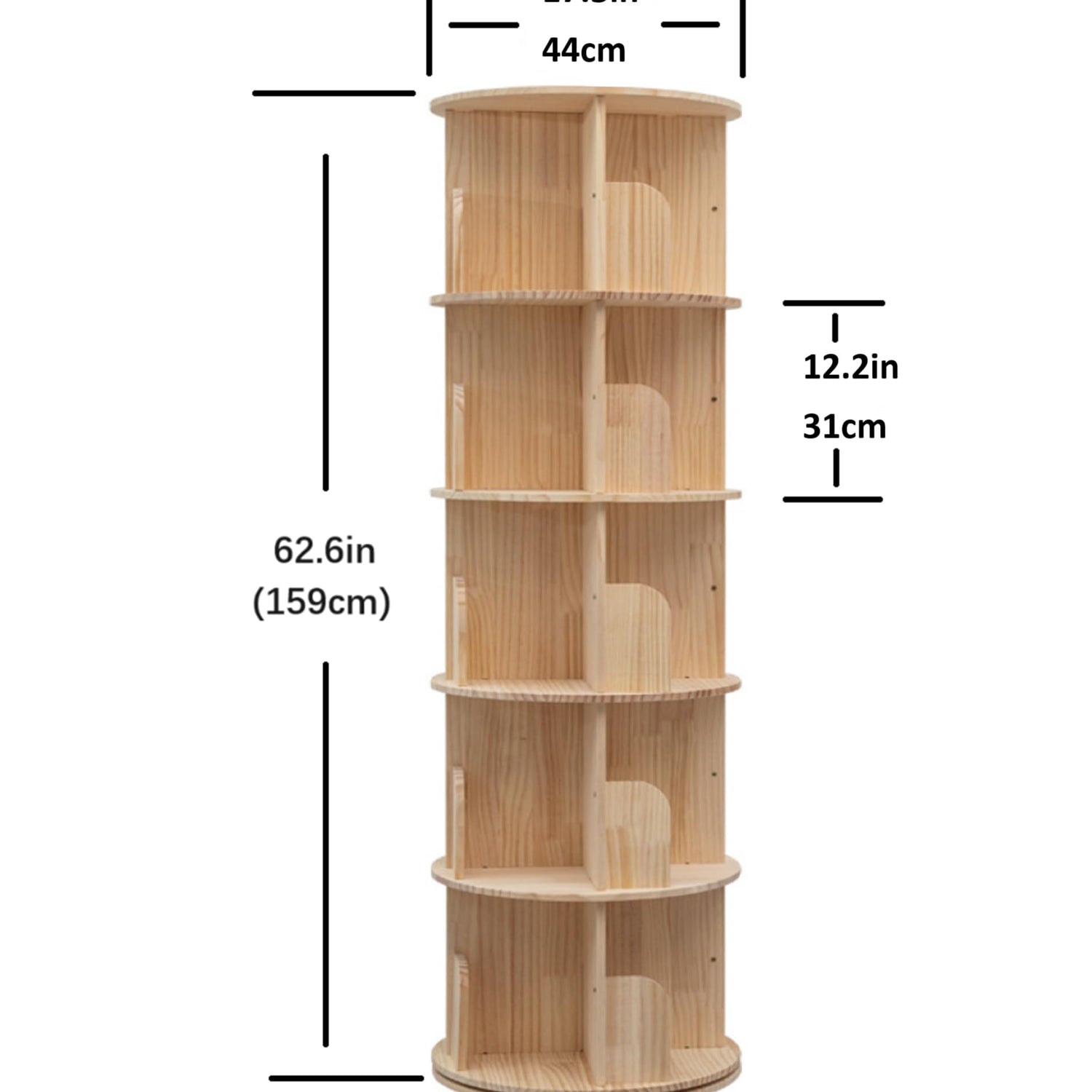 - Size: The diameter is larger than other products! The total height of the bookshelf: 62.5 inch (159cm). A total of 5 layers, each layer height: 12.2 inch (31cm). Diameter: 17.3 inch (44cm).