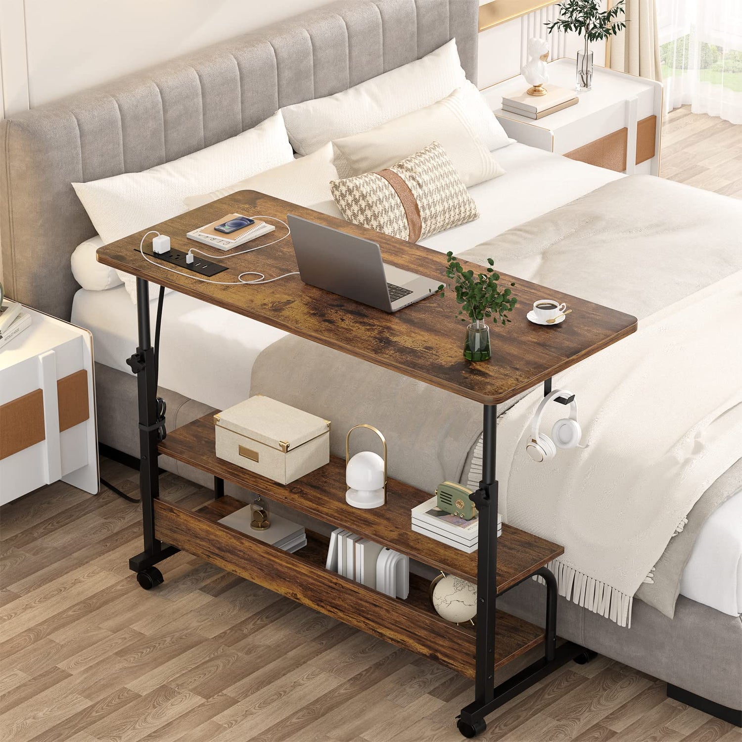 - 【Multi-Function】The rolling computer desk equipped with 4 high-quality smooth rotary wheels and non-slip footpads, you can move the desk wherever you want or fixed in one place, it offers stable moving and fantastic working experience. 2 tier opening storage shelves are convenient for you to place daily necessities and other items. Two extra desk iron hooks can save the most of your space.