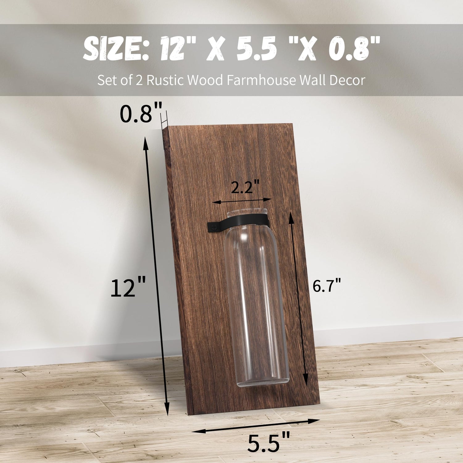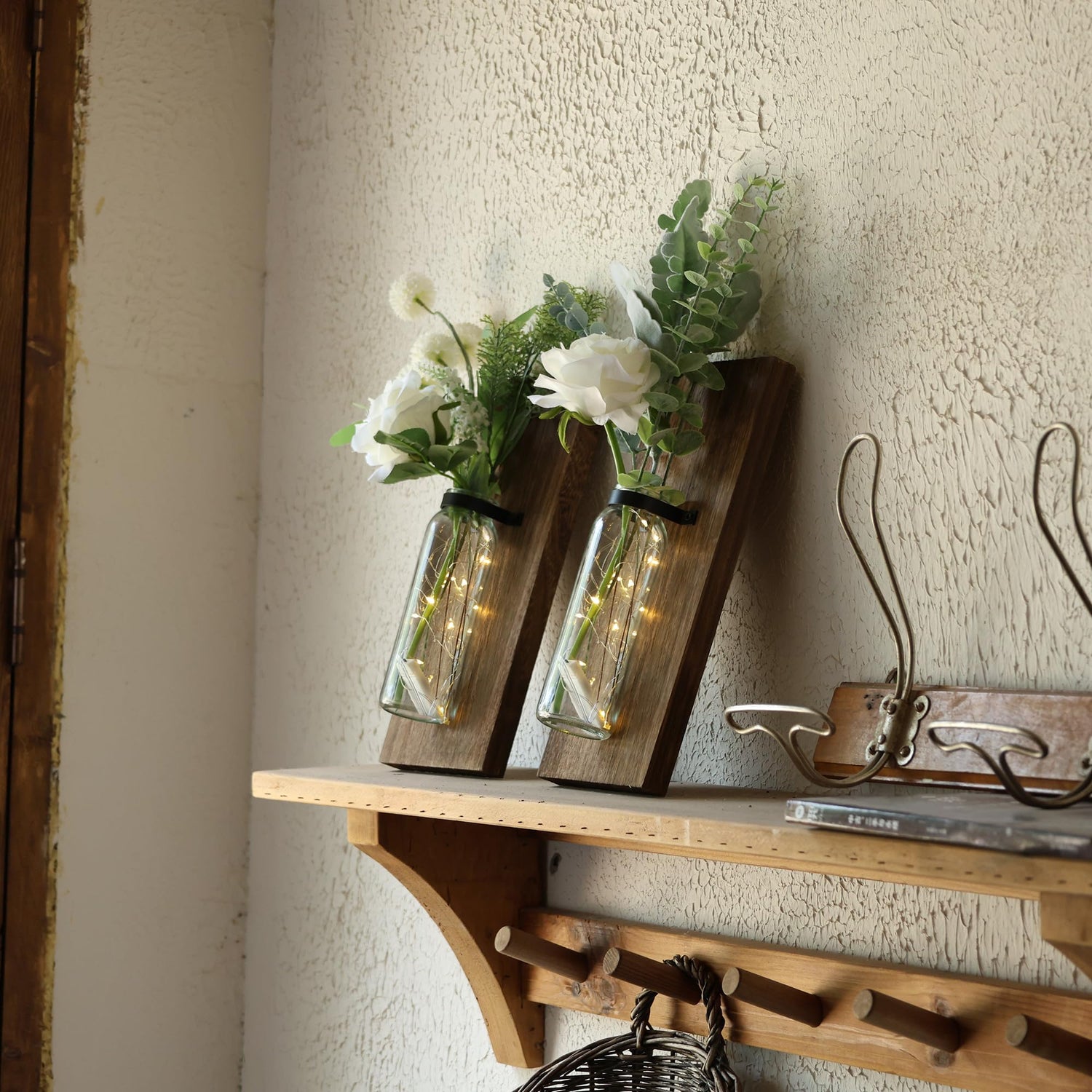 - RUSTIC WOOD FARMHOUSE WALL DECOR: The package includes 2 pack wood wall glass vases and 2 string lights. Our wall-hanging wood wall planter is thoughtfully designed to be both functional and visually appealing. The floating design gives it a natural and rustic look, allowing it to blend seamlessly into any room wall decor. They are perfect for a space that needs to be topped off with some gorgeous simplicity, like wood tones and greenery!