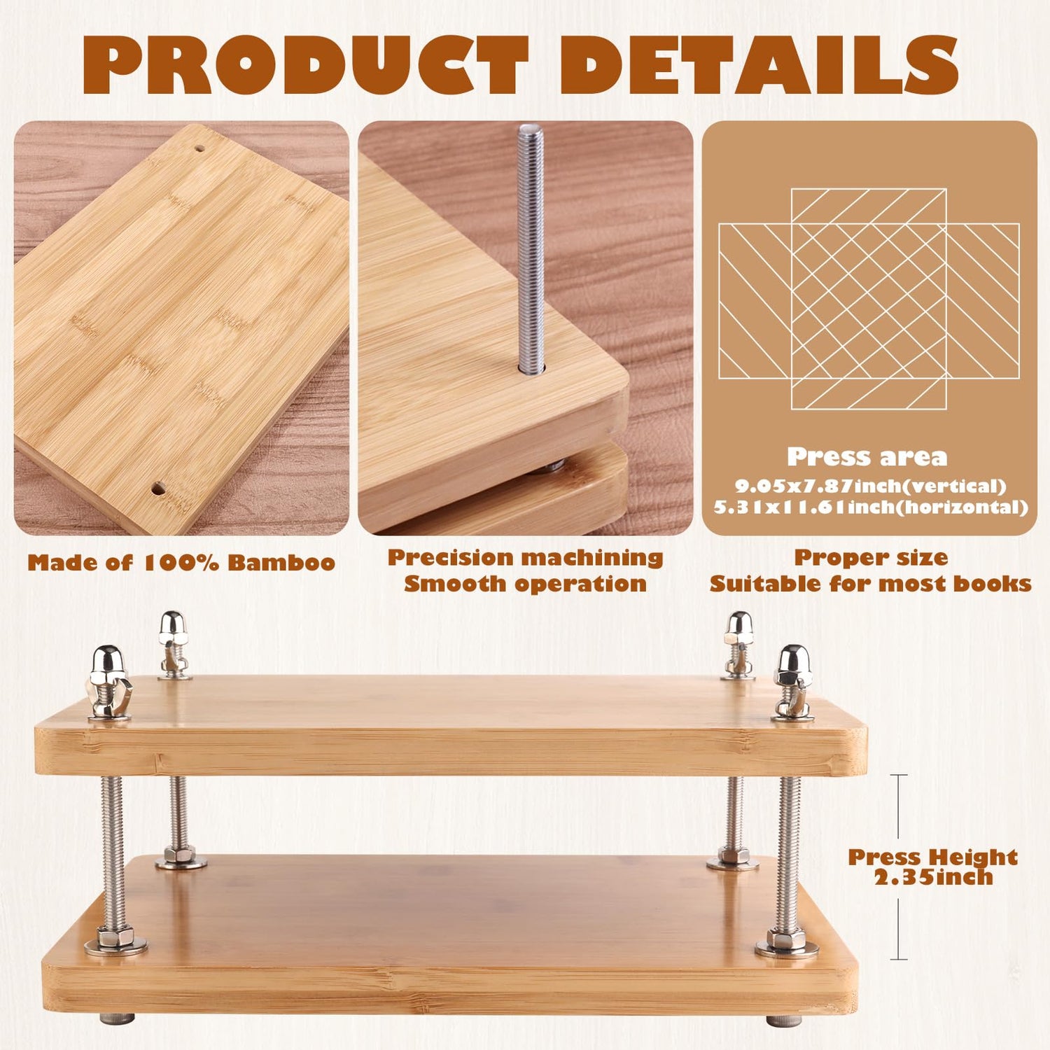 - 【Beautiful and Sturdy】 This book press is characterized by bamboo and wooden cross-board construction, designed to be sturdy and convenient. It's smooth, with rounded corners, and through careful design, it not only enhances the aesthetic appeal of the binding kit but also provides users with a comfortable tactile experience. In addition, it comes with detailed operating instructions to help you easily mount.