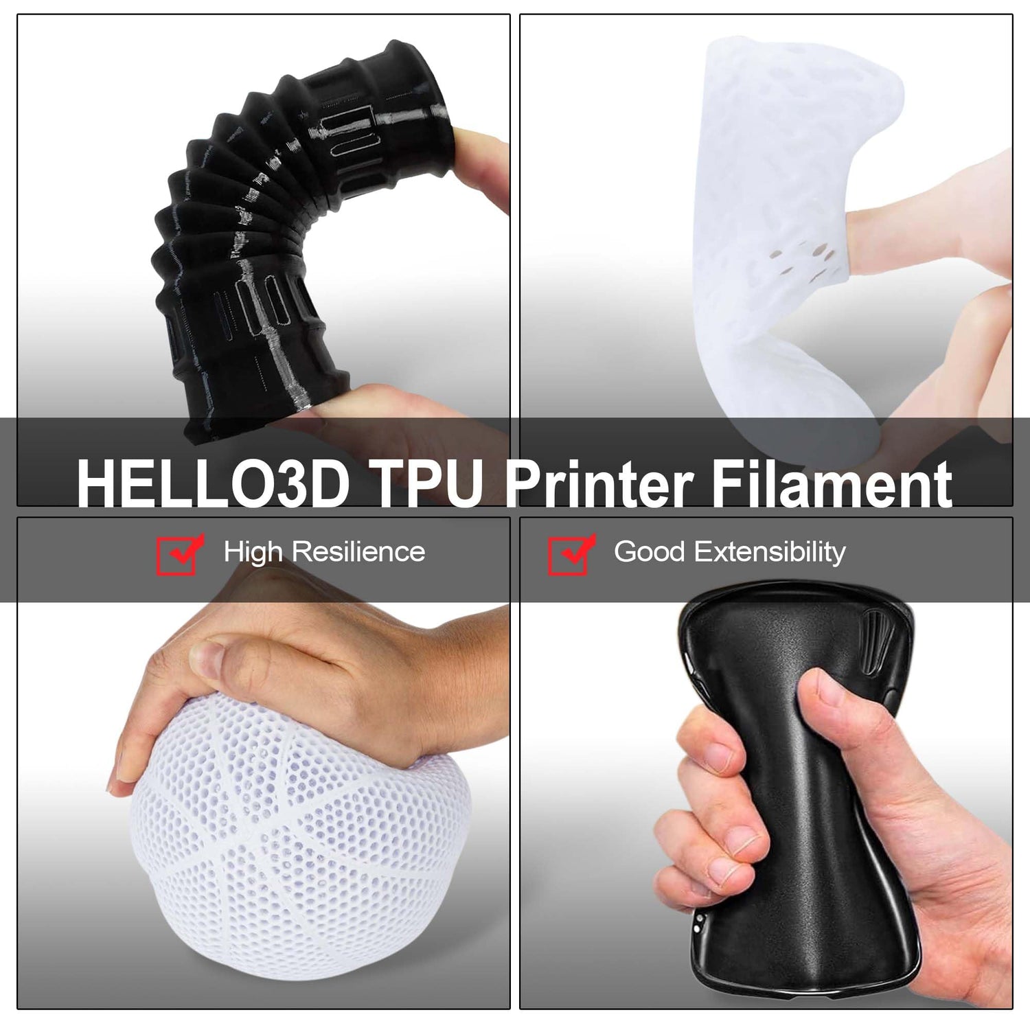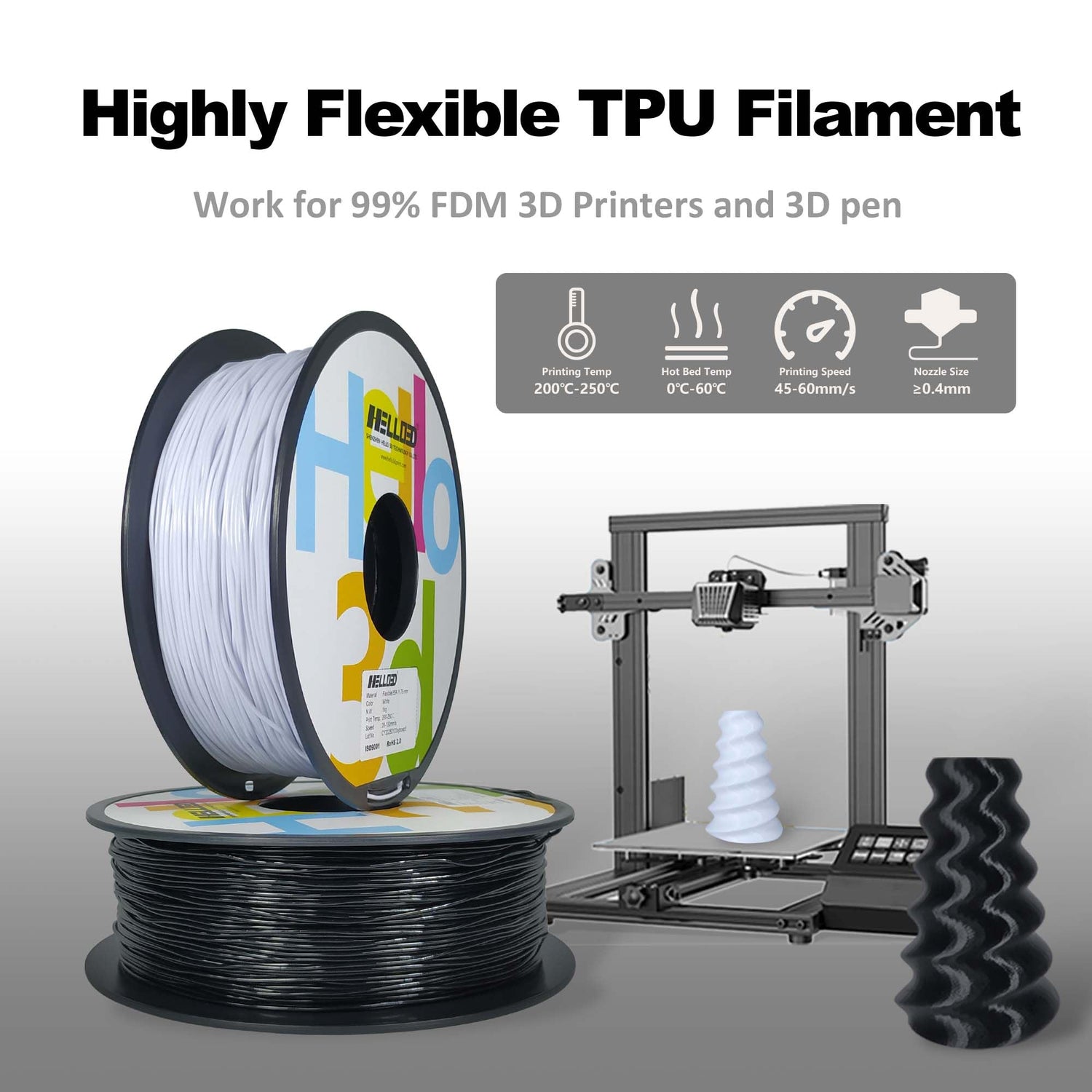 - 【Soft & Highly Elastic Filament】TPU Flexible Filament is a thermoplastic polyurethane (TPU) based filament specifically designed for use in most desktop 3D printers. With a Shore hardness of 85A, it can withstand greater bending and stretching, making it suitable for parts that are soft and require frequent deformation. Examples include cable jacketing, customized footwear, medical devices, flexible wearables, and more!