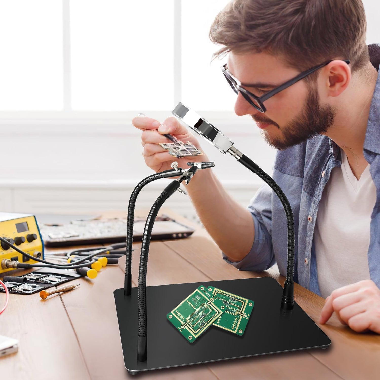 - Circuit Board Holder with 6X Soldering Magnifying Glass: Our soldering helping hands with weighted solid steel base, great for soldering, assembly, repair, hobbies, jewelry and crafts. With flexible and strong metal arms, stable soldering stand and 6X Magnifier, the PCB board can be fixed to the best position you want.