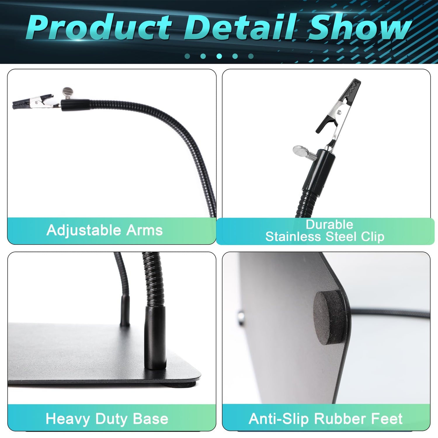 - Heavy Solid Steel Duty Base: 7 x 9 inch Heavy steel base ensures your soldering station kit won't tip over. There are 4 anti-slip rubber feet embedded on the bottom to prevent the helping hands soldering station from sliding on the workbench and protect your work surface from scratches and scuffs.