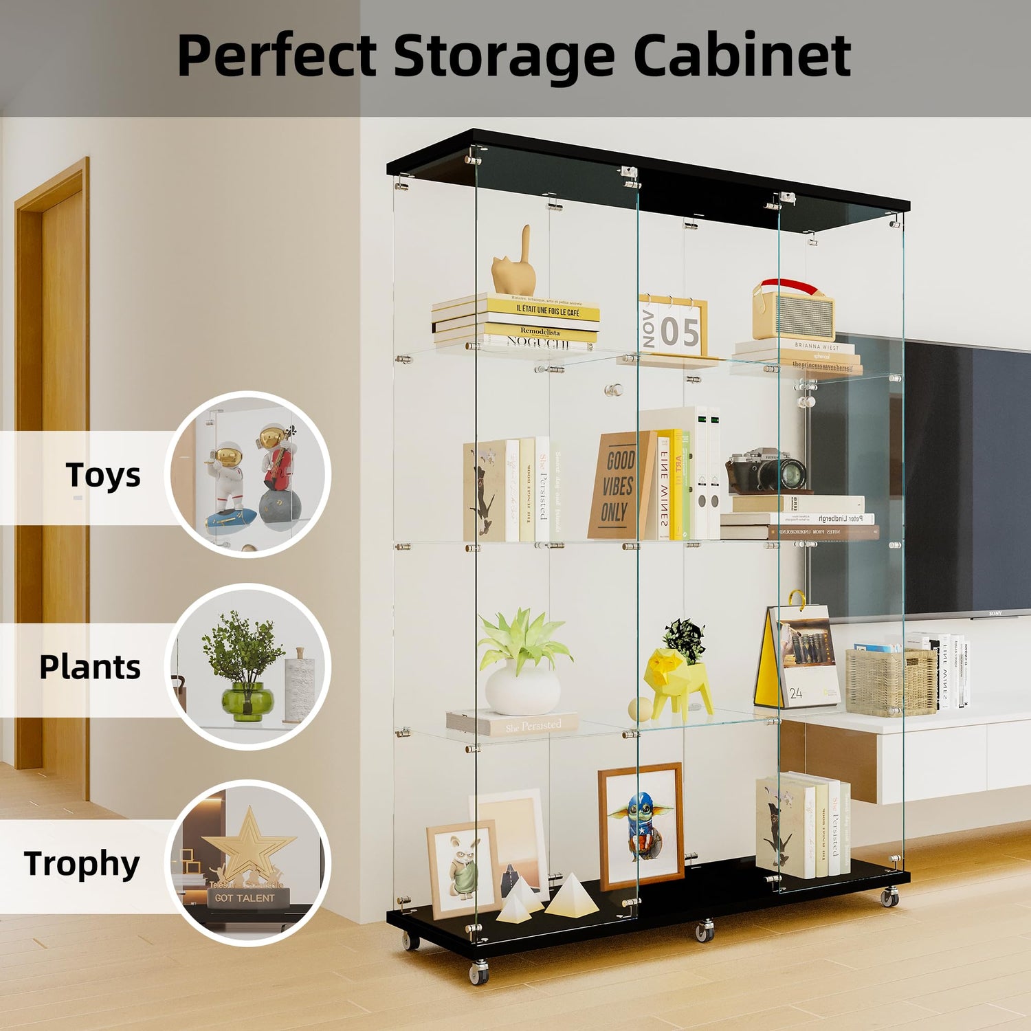 Henf Glass Display Cabinet with 4 Shelves&Wheels,Extra Large Double Doors Curio Cabinets with Lock Floor Standing Display Case Display Case for Living Room,47.71" W x 14.37" D x 66.53" H,Black