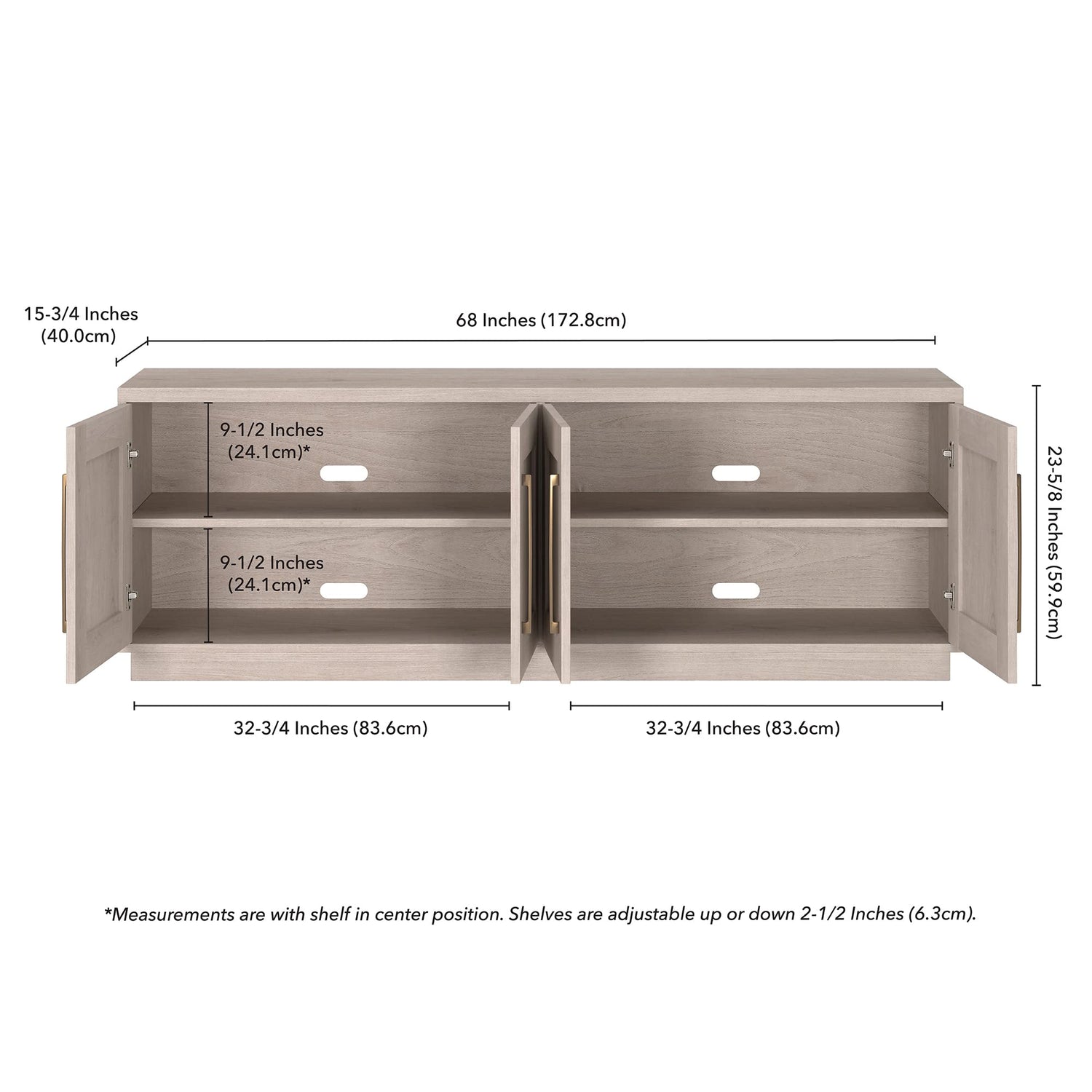 Details: Combine functionality and classic transitional design with this modern TV stand. Its rich wood tone creates a warm neutral palette that will blend seamlessly into any color scheme, while its classic styling pairs perfectly with the existing design inspiration of your living room, den, or game room. This solid-backed stand features two large enclosed cabinets with sleek brass-finished hardware. Cable management cut-outs and adjustable inner shelves help keep your media storage and consoles organized.
