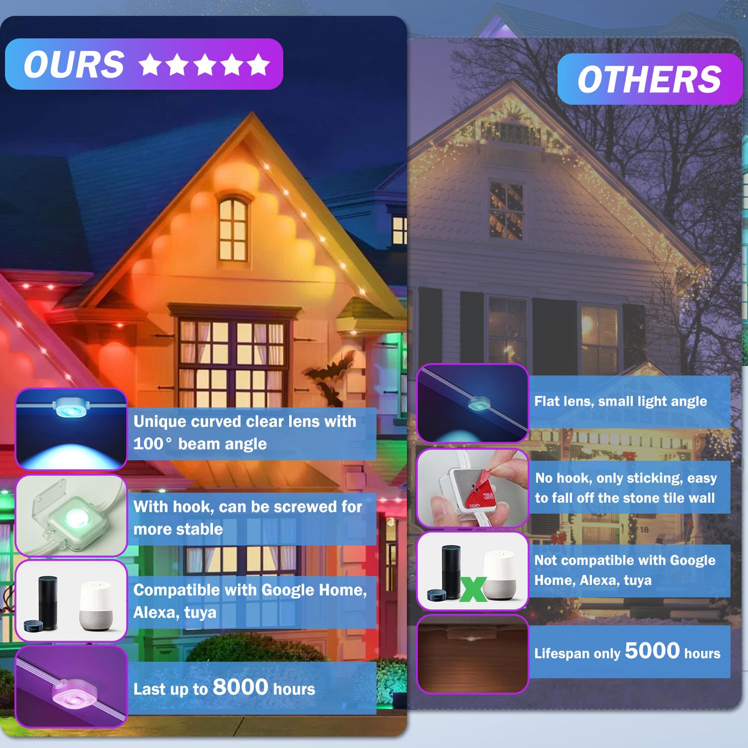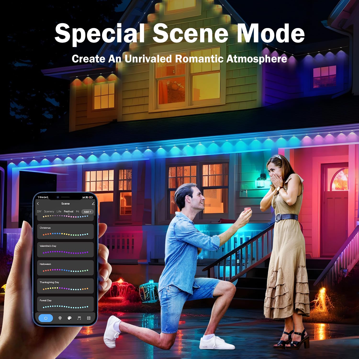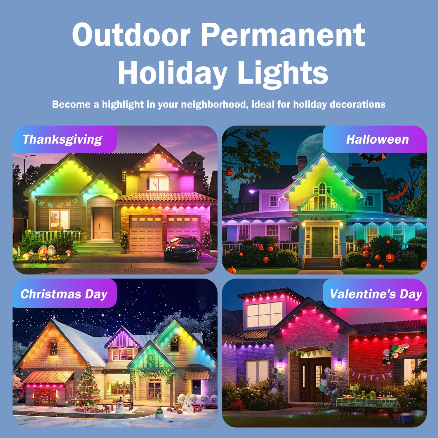 - Multifunctional Outdoor Permanent Christmas Lights: Unlock 44 scene modes with unlimited DIY possibilities with our 100 feet permanent outdoor lights. Create a personalized light display with one click via APP on your phone for daily use or festive occasions such as Christmas and Halloween to create the perfect atmosphere.