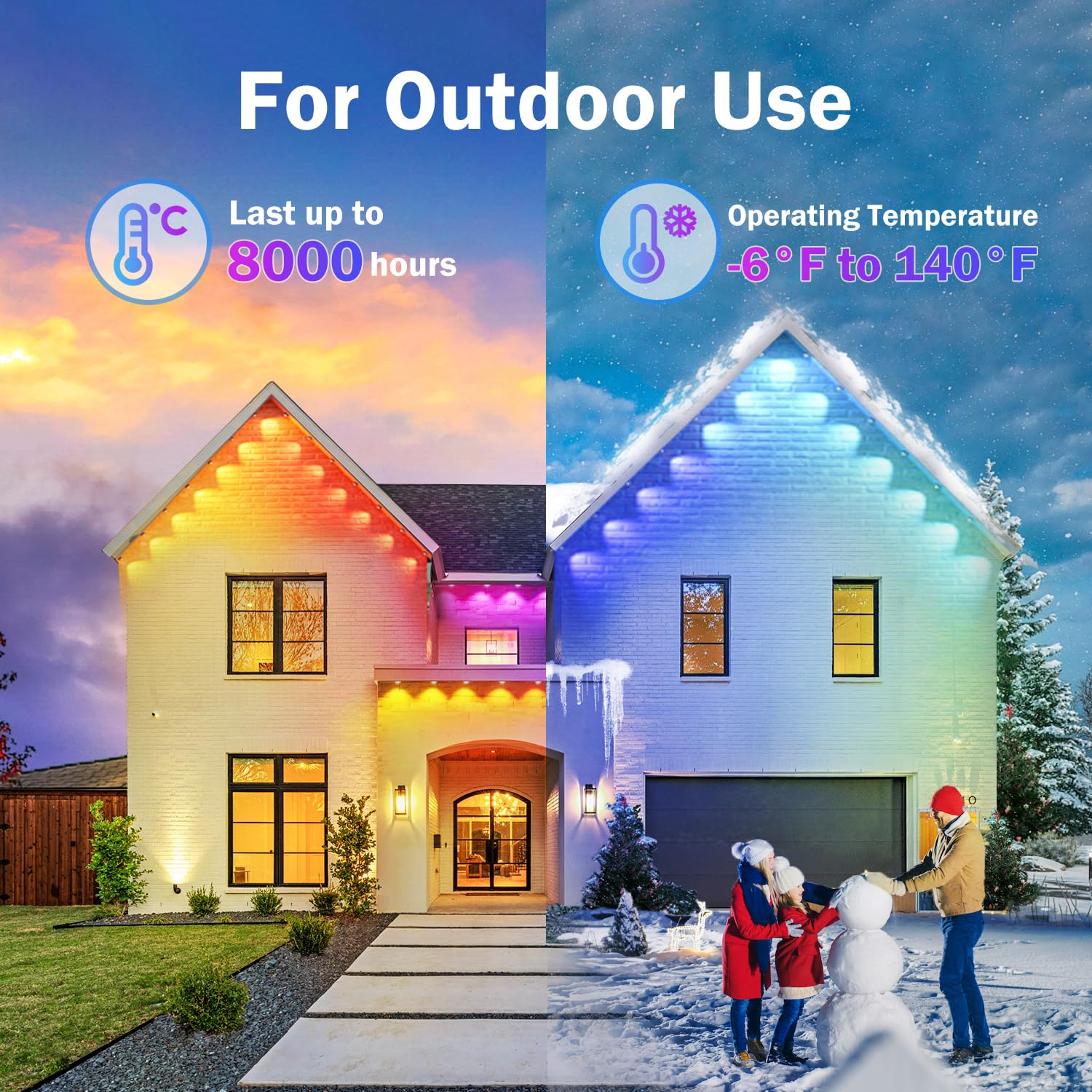 - Excellent Durability: Our permanent outdoor lights are made of high quality PVC and UV resistant materials with IP65 waterproof rating. Able to withstand harsh weather conditions and operate properly in temperatures ranging from -4°F to 140°F, they have a lifespan of up to 80,000 hours, allowing you to enjoy brilliant light displays all year round.