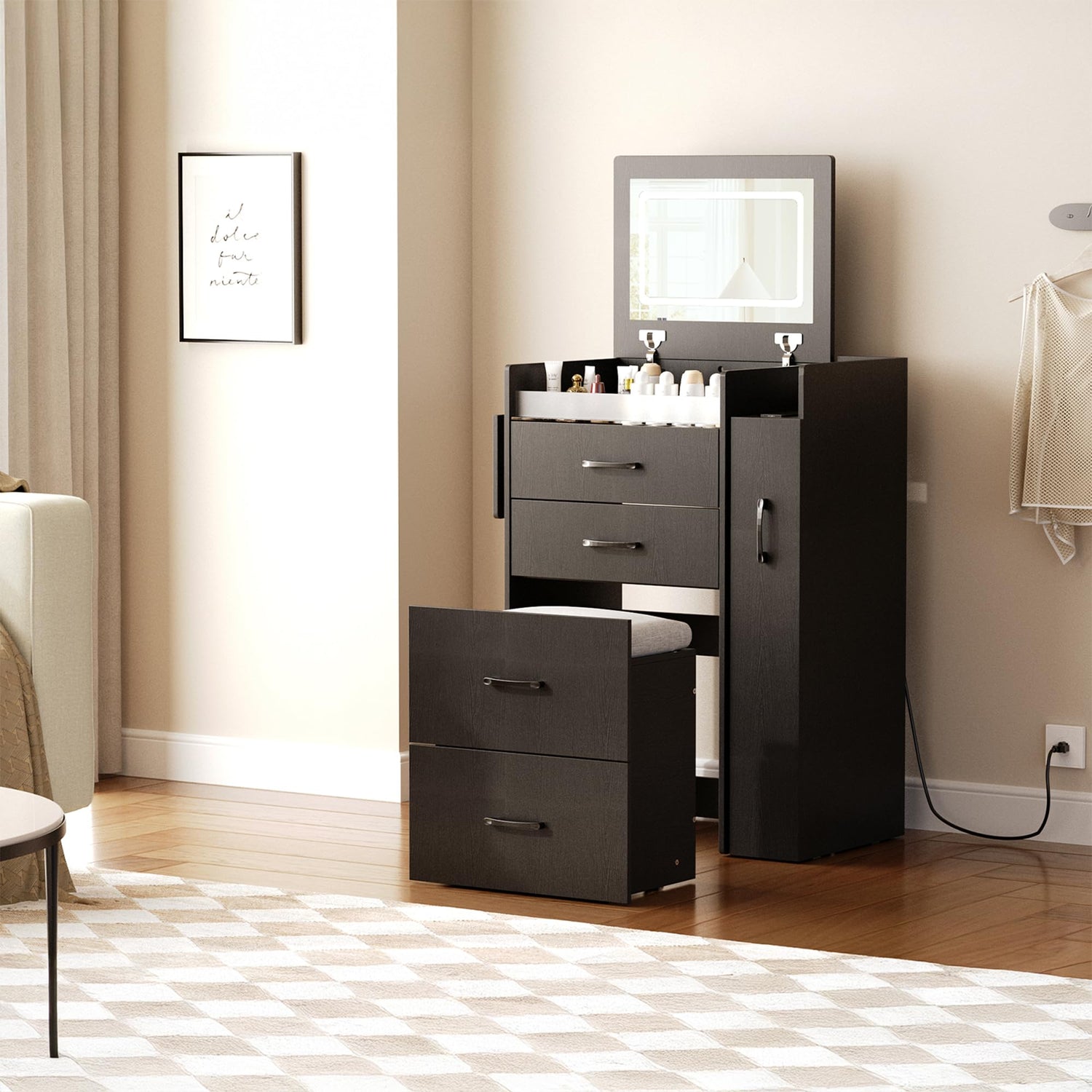 Herture 3 in 1 Vanity Desk with Flip Top Mirror, LED Lights, Side Cabinet,Collapsible Desk Panel, Hidden Stool with Storage, Small Makeup Vanity Table with Power Outlets, Compact Vanity, Black PT01DTB