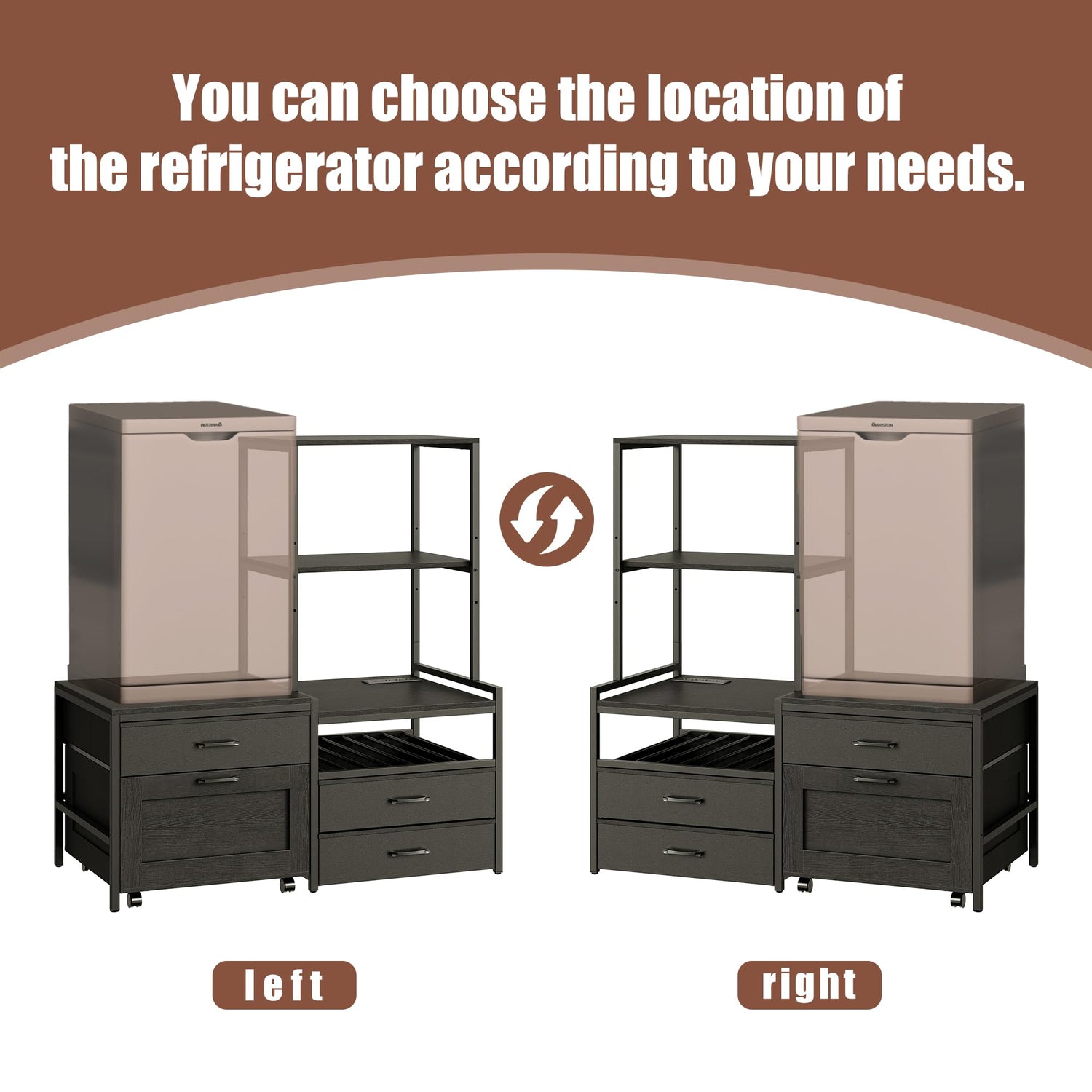 - Adjustable Space - Mini Fridge Stand Compatible with Different Small Appliances. The top right side features three adjustable shelves, ideal for placing kitchen appliances such as a coffee machine or microwave. The middle shelf can be adjusted vertically within a 3.93-inch range, making it easy to accommodate small appliances of various sizes, meeting diverse storage needs with great flexibility.