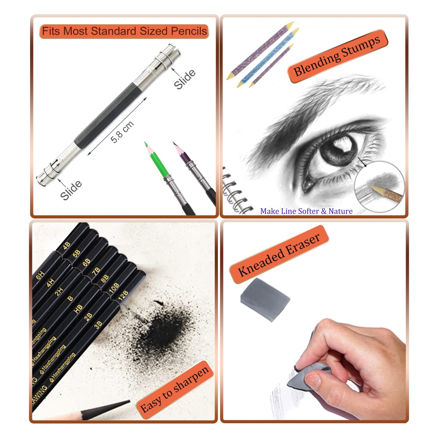- 【11pcs Drawing accessories in the Artists Drawing Sets】Also includes 1 standard eraser, 1 kneaded eraser, 3 blending stumps (size: S, M, L), and 1 sharpener, 1 pencil extender, 1 sandpaper block, 1 ruller, 1 sketch book, all pencil and pencil tool can be well orgnized in 1 cute colorful travel case.