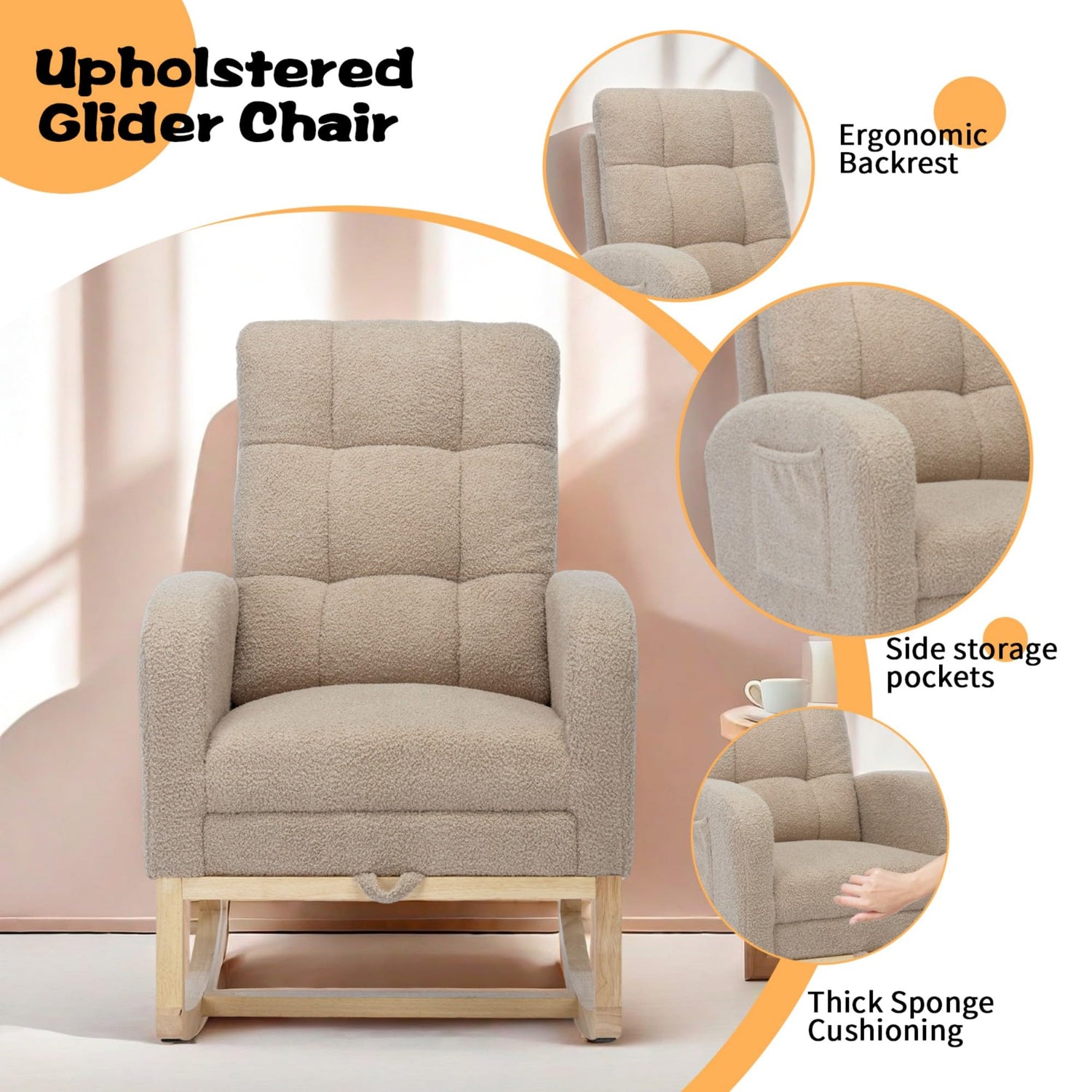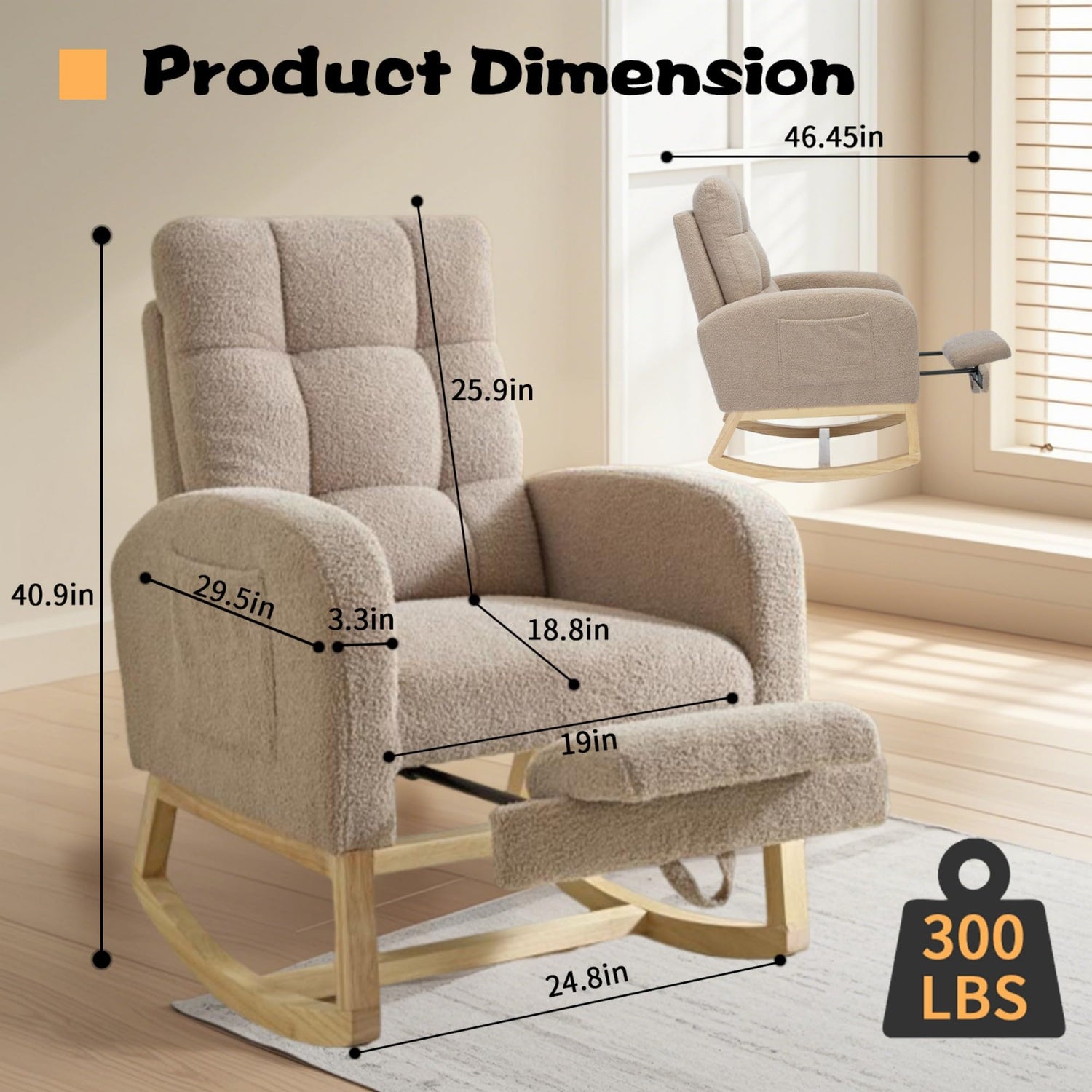 Hevaotry Nursery Rocking Chair with Adjustable Footrest for Living Room,Teddy Fabric Rocking Chair with Solid Wooden Legs,Comfortable Lounge Armchair with Side Pockets and High Backrest(Light Coffee)