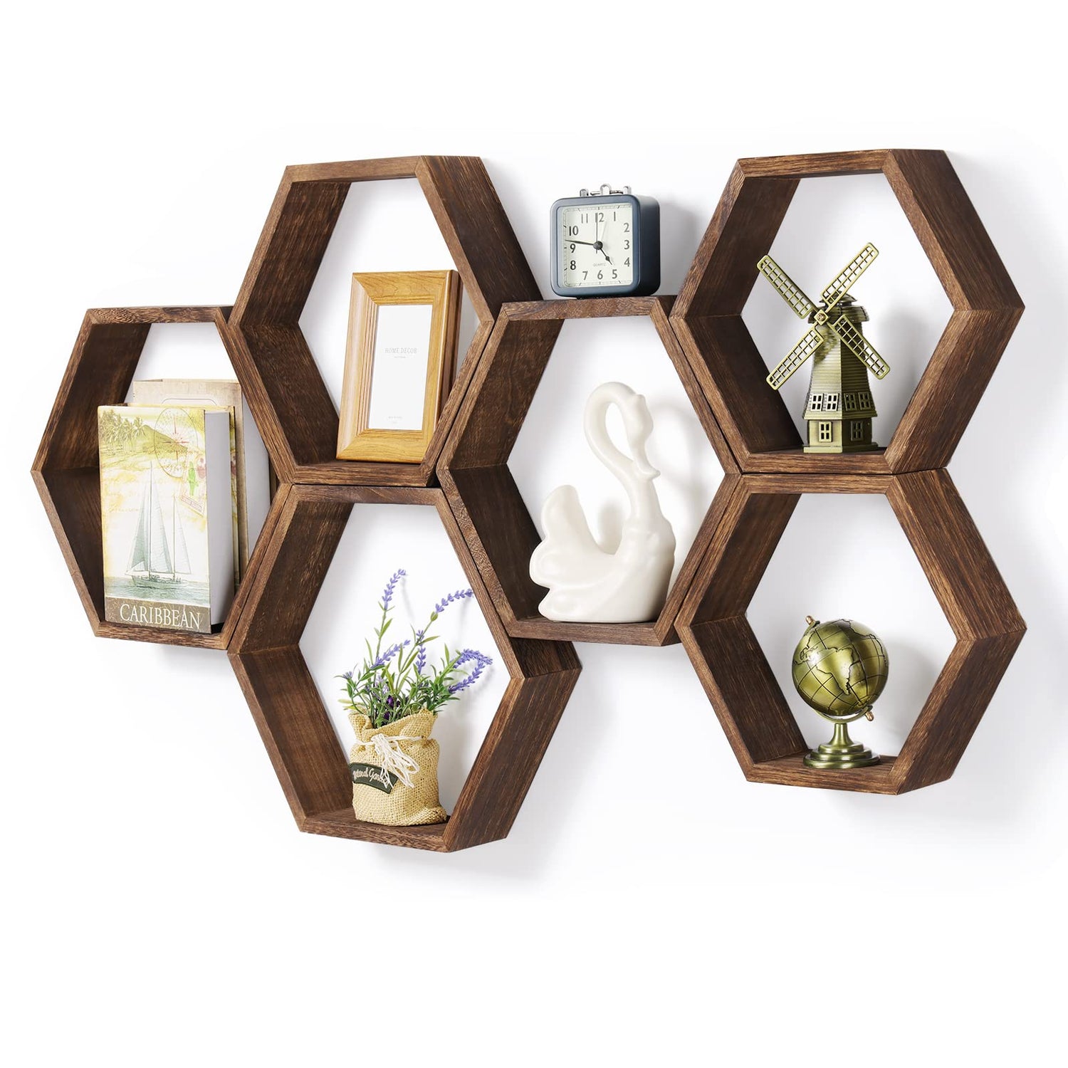 - WALL DECORATION FOR HOME - These shelves for wall can be used separately in different rooms or in groups. Use multiple sets to make eye-catching patterns. These honeycomb wall racks are also a great choice for decorating coffee corners. Use brown floating hexagon wall racks create your own unique shape and immediately dress up your home!