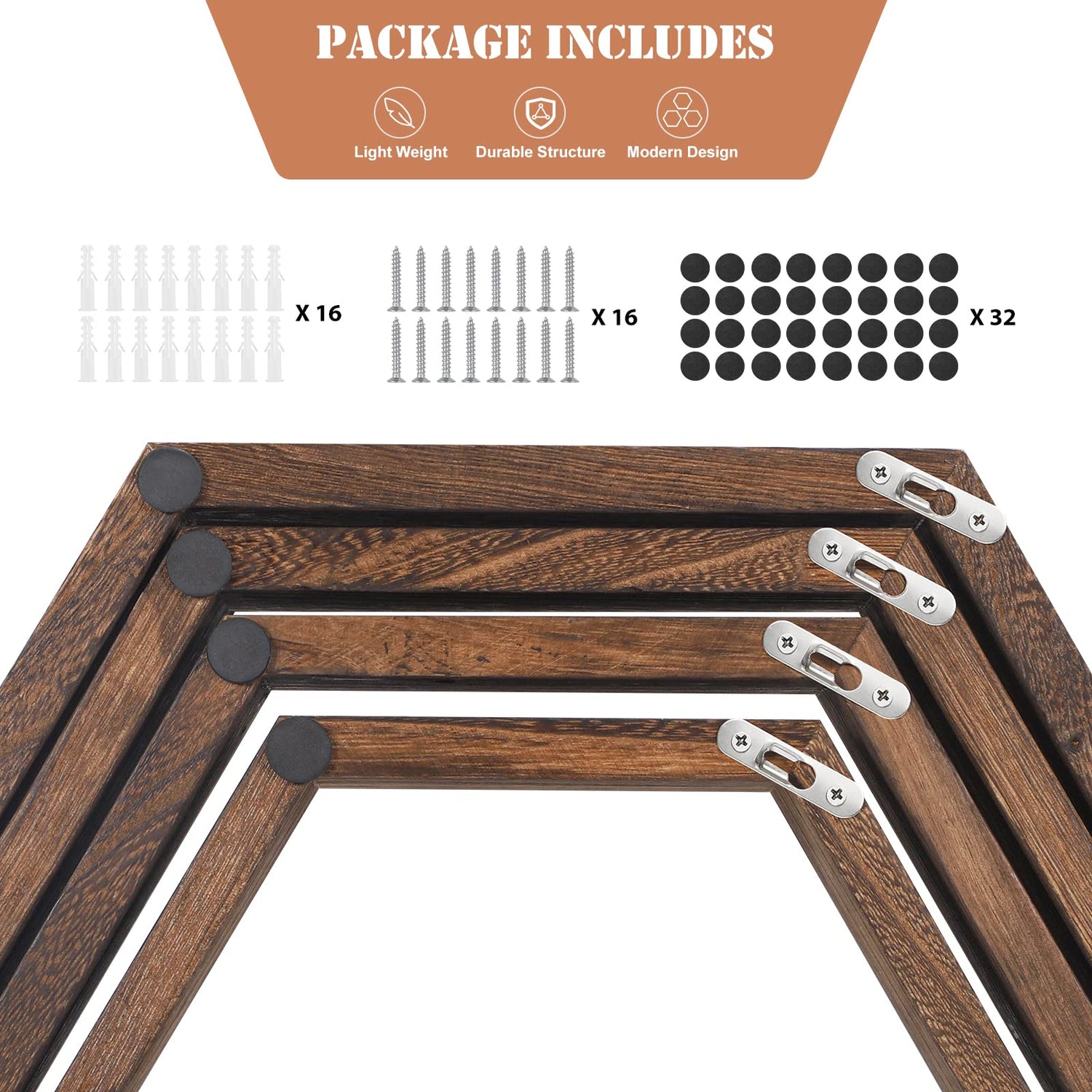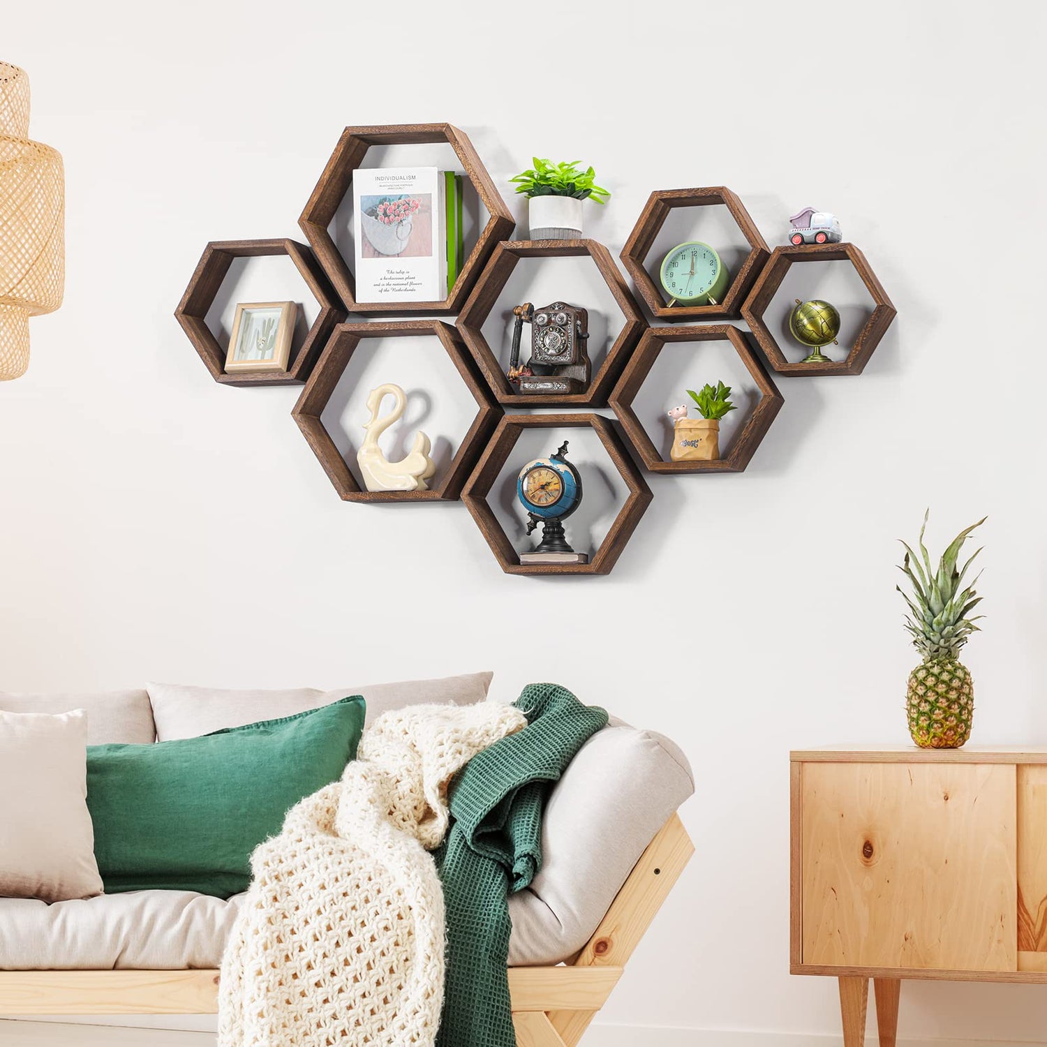- FARMHOUSE STYLE - Unique burnt wood combined with a stylish hexagonal design appearance, these honeycomb decor shelves bring a strong farmhouse flavor to the walls of your room and a sense of design. When friends come to visit, they will be amazed at the beautiful hexagon floating shelves set of 8, like a magazine cover!
