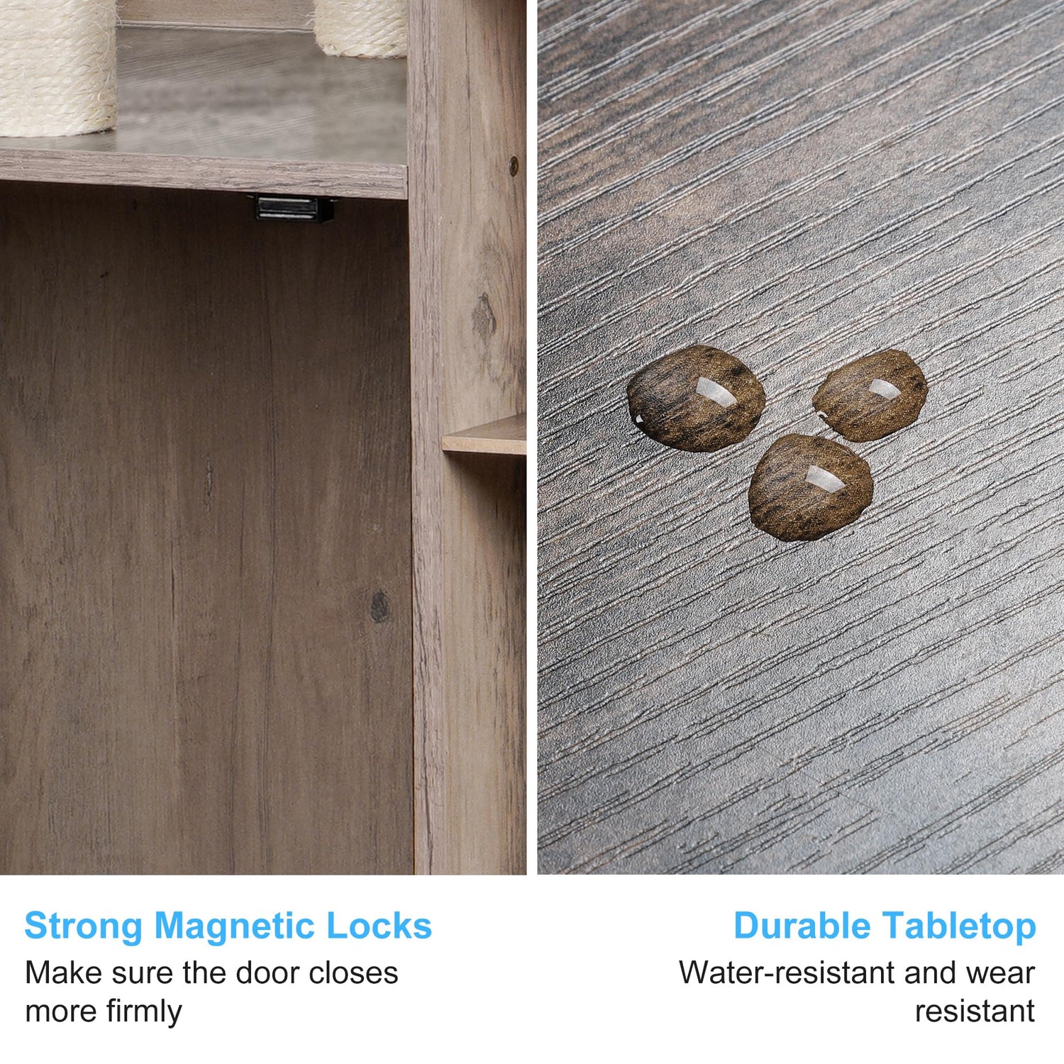- All-in-one cat tree house: It allows to keep everything about your cat in one place. Waterproof and scratch-resistant surface makes the furniture easier to clean. The cabinet can hides the cat litter box and makes the room look neater