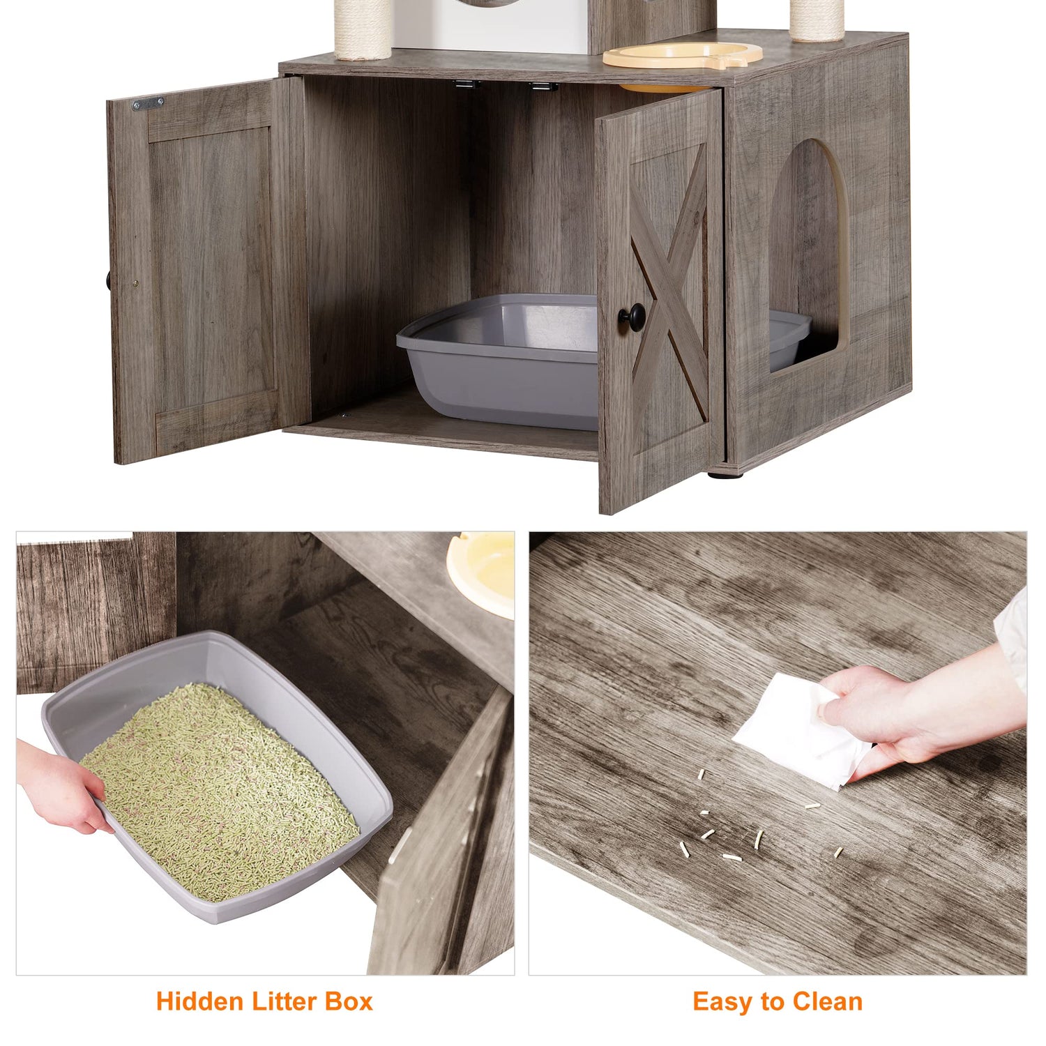 Heybly Cat Tree, Wood Litter Box Enclosure with Food Station, All-in-one Indoor Cat Furniture with Large Platform and Condo, Modern Style Cat Tower, Hammock, Rustic Brown HCT102SG