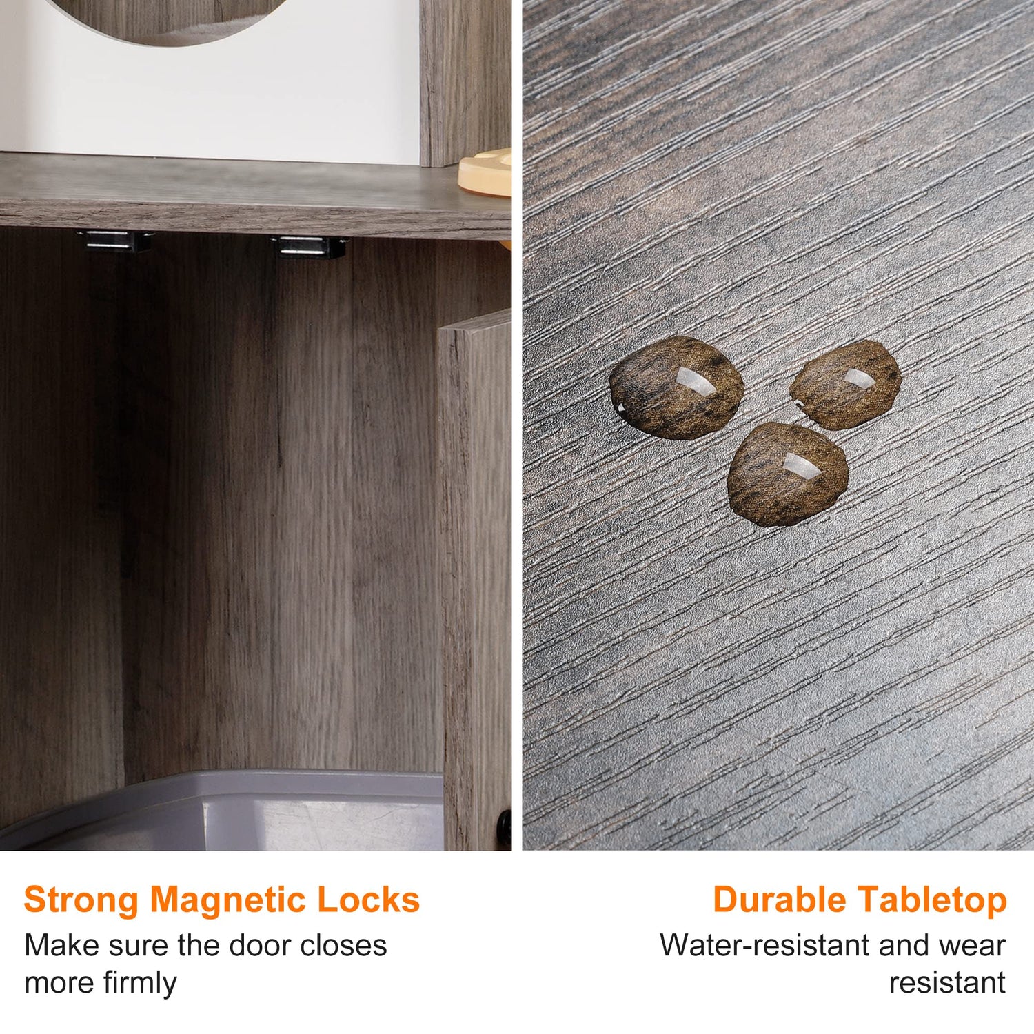 - Thoughtful Details: The litter box room doors are magnetic, cats cannot easily open doors from the inside. Door designed with vents, bring fresh air and soft light in. Adjustabel feet keep the entire cat tower stable while protecting the floor from scratches.