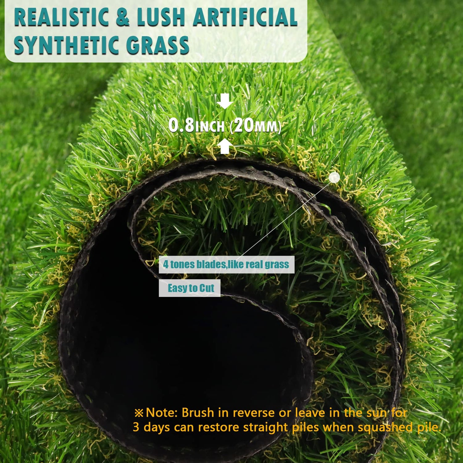 - Sturdy Artificial Grass--The height of the artificial grass rug outdoor is 20MM(0.8 inch). 4 tones Synthetic grass looks and feels like real natural lawn, has excellent UV resistant, fireproof, waterproof, weather resistant.If turf roll grass pile be squashed . Don't worry, just need to reverse brush or be left for 3 days in sun to recover straight pile naturally.