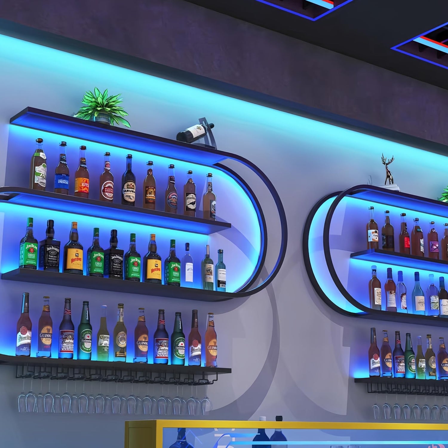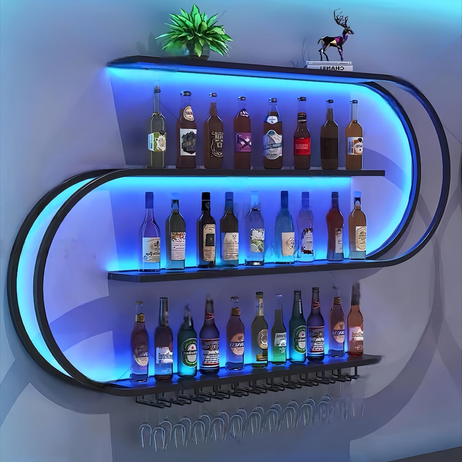 - Space-Efficient Semi-Circular Design - This 4-tier black metal wall wine rack combines a functional storage solution with modern decor. The curved silhouette with integrated glass holder saves counter space while creating an eye-catching display for wine bottles and spirits. Adjustable warm yellow/blue LED strips add ambient lighting perfect for bars or cafe corners.
