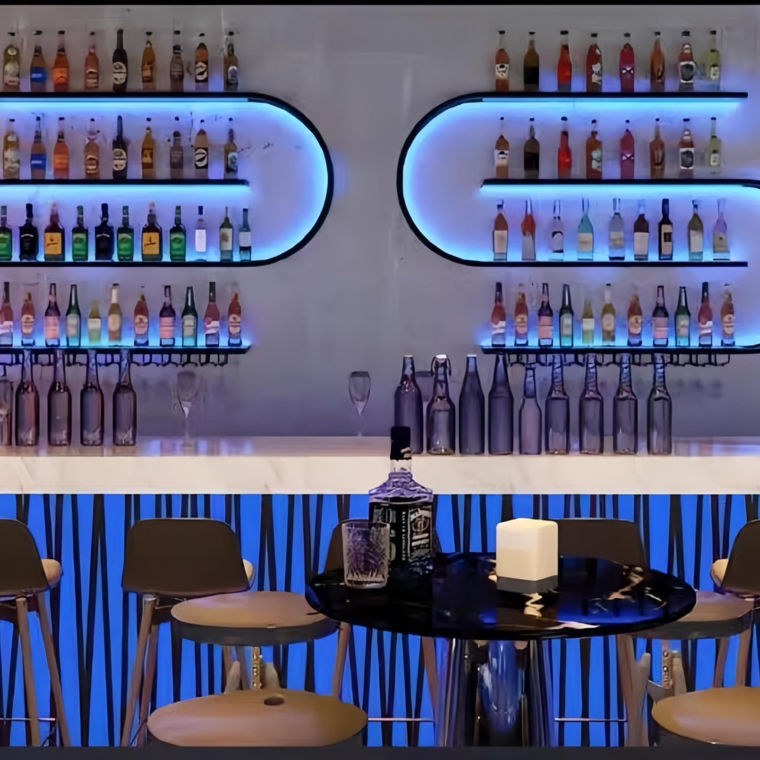 - Dual-Colored Lighting & Multi-Level Storage - Choose between warm ambiance lighting or cool blue accent illumination to match your mood. Four spacious tiers accommodate tall spirit bottles, while the bottom wine glass rack neatly stores stemware - ideal for keeping kitchen or bar areas clutter-free.