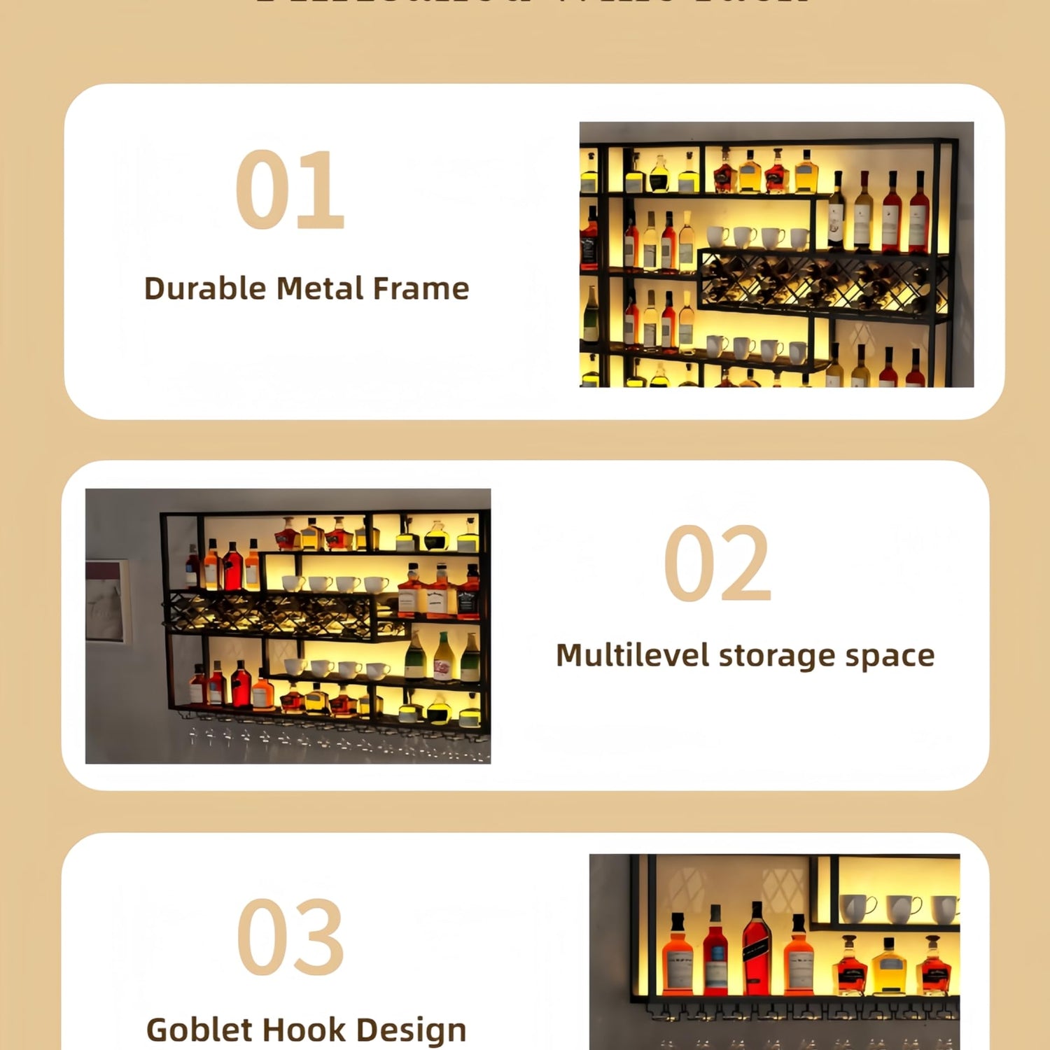 - Wall-Mounted Liquor Shelf with Integrated LED Lighting - Enhance your collection with subtle illumination using this liquor shelf wall mounted, equipped with energy-efficient LED lights. The soft glow accentuates bottles in your wall wine rack for wine bottles, creating a sophisticated focal point for home bars or dining spaces.