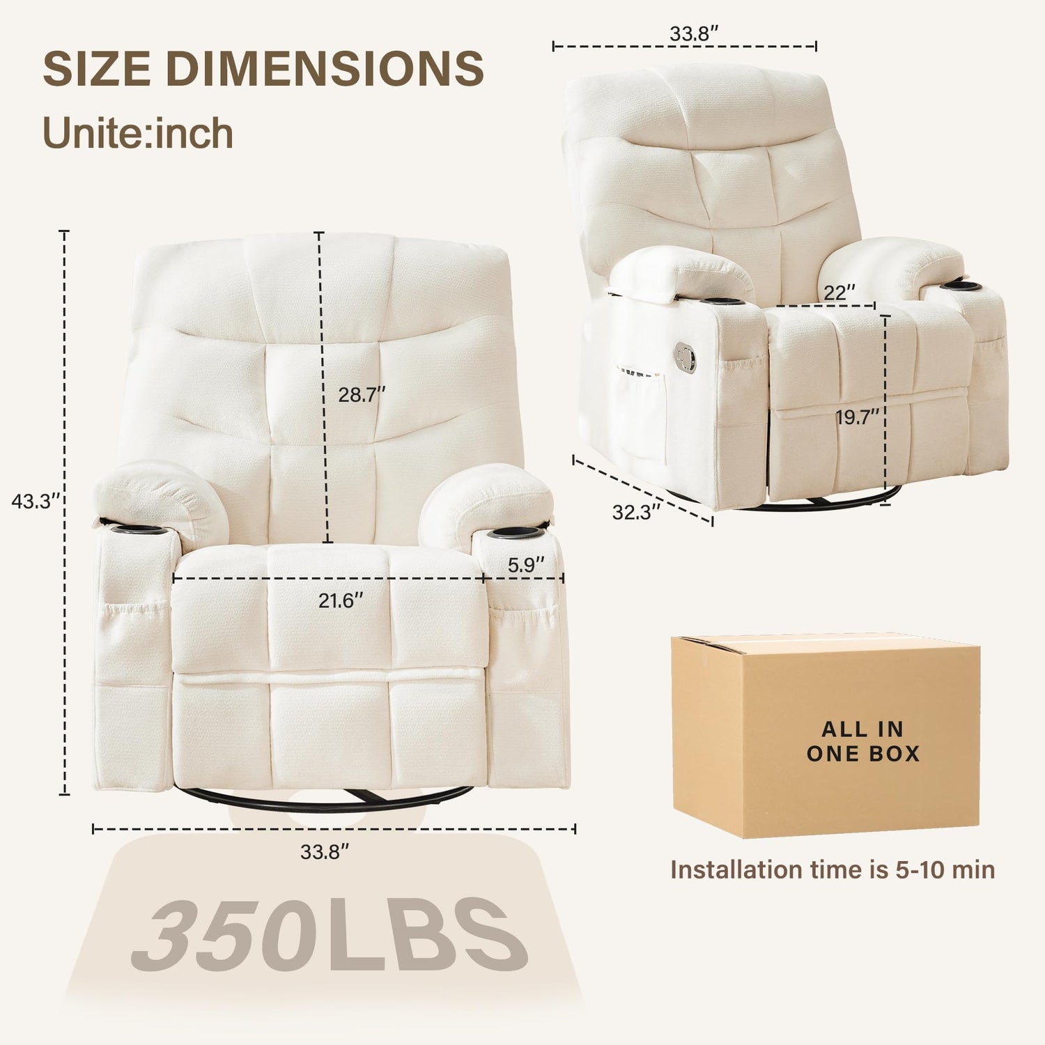 - Easy Assembly for Long-term Use:The swivel recliner comes in an individual box with assembly and usage instructions.The installation process is very simple and can be completed in just 5-10 minutes without any additional tools. This user-friendly assembly process ensures that you can enjoy your new recliner quickly and easily.Designed for long-term use, recliner with cup holder not only provides instant comfort, but also is durable and easy to maintain.