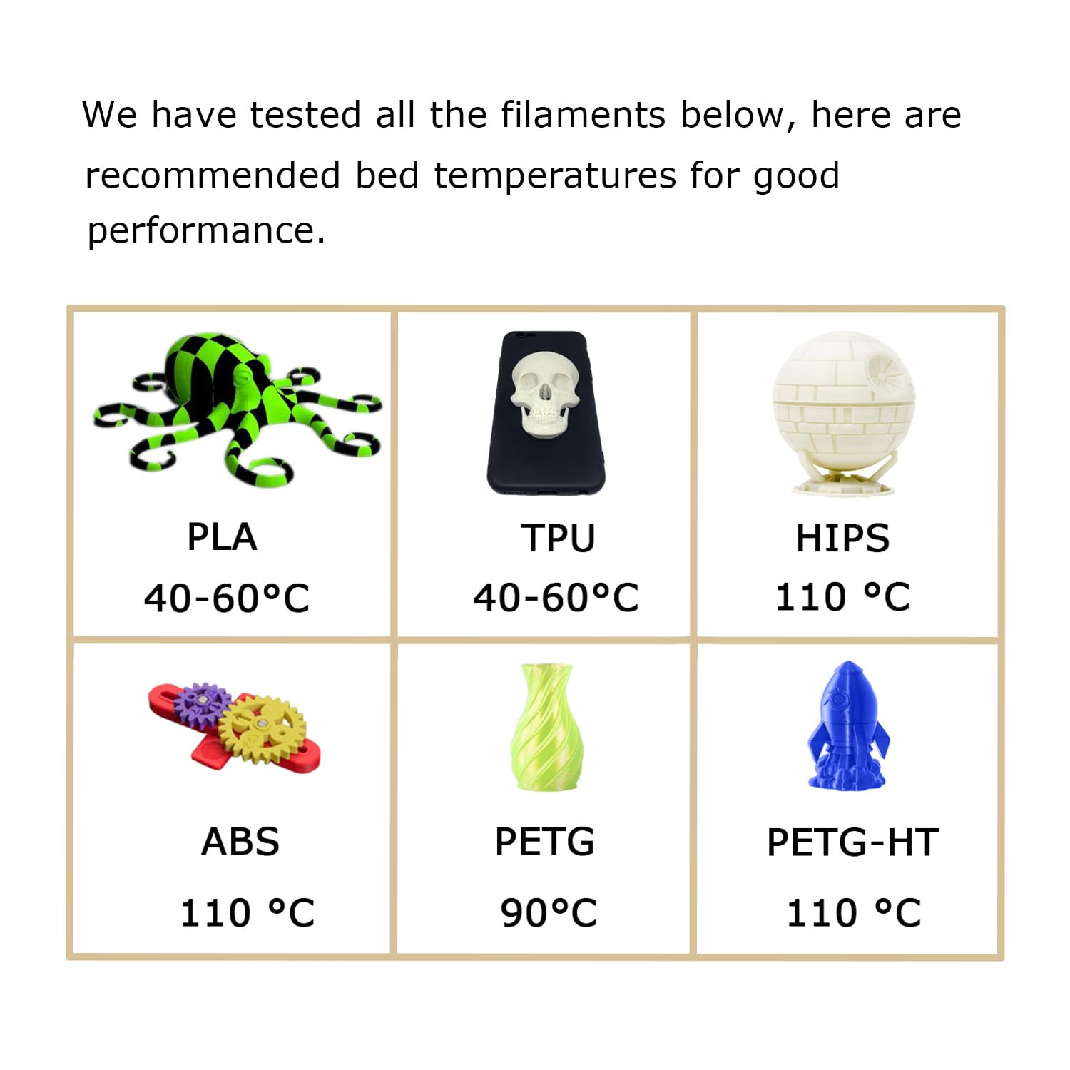 - 3 Excellent adhesion can be achieved when the temperature of the heated bed is about 60℃, you can print directly on the HICTOP PEI sheet without using any glue or other tools to help the model to stick onto the sheet. You do not need to worry about the prints curling with a 60℃ bed temperature.It also can print PETG very well, but the temperature of the hotbed needs to be about 80-85℃
