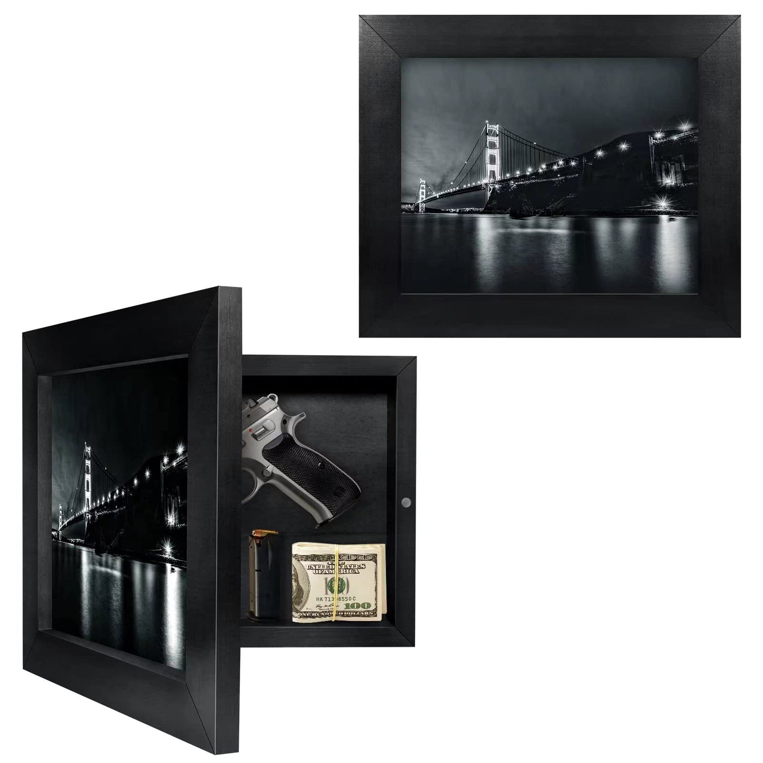 - Flexible Space Size: Concealment furniture frame comes with 8 x 10" "Golden Gate Bridge" picture, or you can also change your favorite photo at any time. Internal storable dimensions: 9.5"x7.5"x1.85" / 24.2x19.2x4.7cm, Fits most pistols.