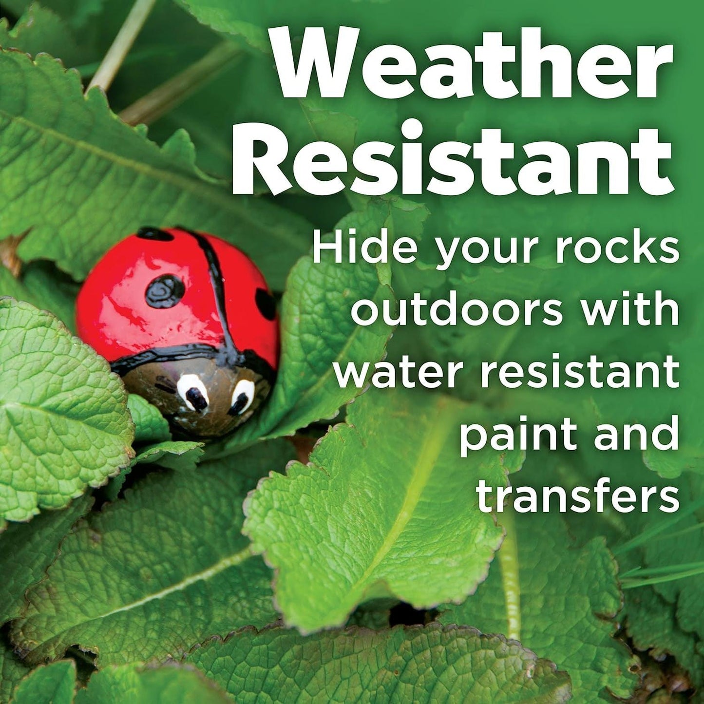 - WATERPROOF ART SUPPLIES: Hide your painted rocks outdoors! The Hide and Seek Rock Painting kit includes 8 waterproof paint colors, paint brush, rock transfer designs and tracking stickers perfect for beginner rock painting