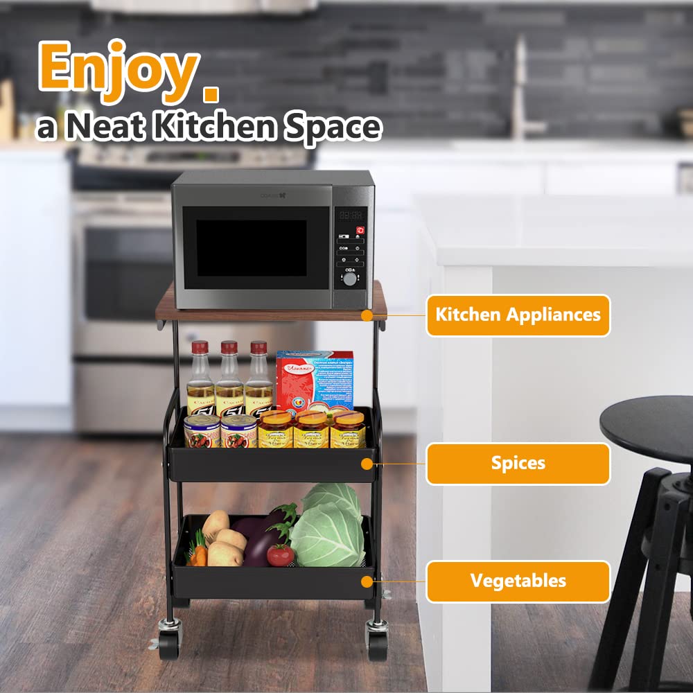 HIDODO Rolling Cart with Wooden Tabletop, 3 Tier Metal Utility Cart, Rolling Storage Organizer Cart with Lockable Wheels for Kitchen, Office, Bedroom (Black)