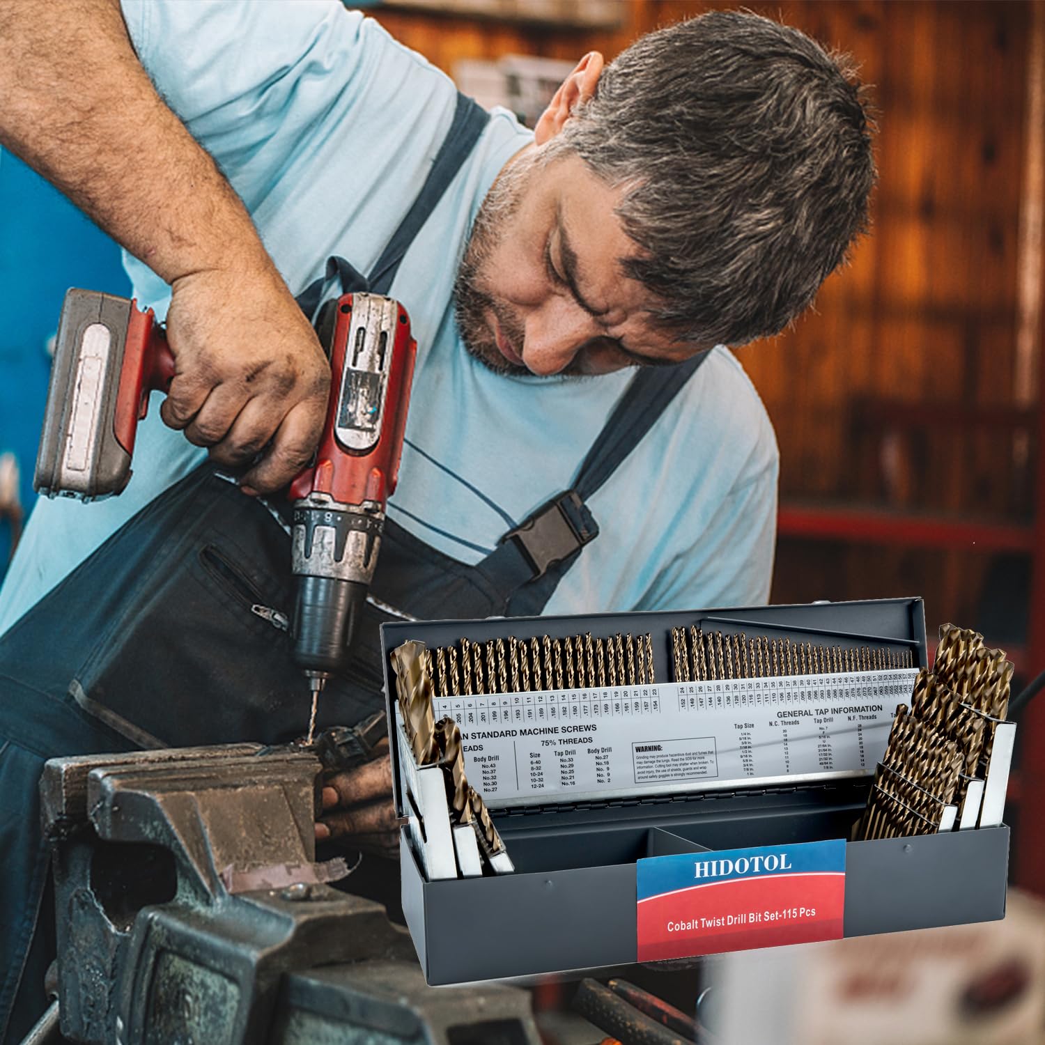 HIDOTOL 115PCS Cobalt Drill Bit Set M35 HSS for Hardened Steel Fractional 1/16"-1/2", Letter A - Z, Wire #1 - #60 with Indexed Metal Case
