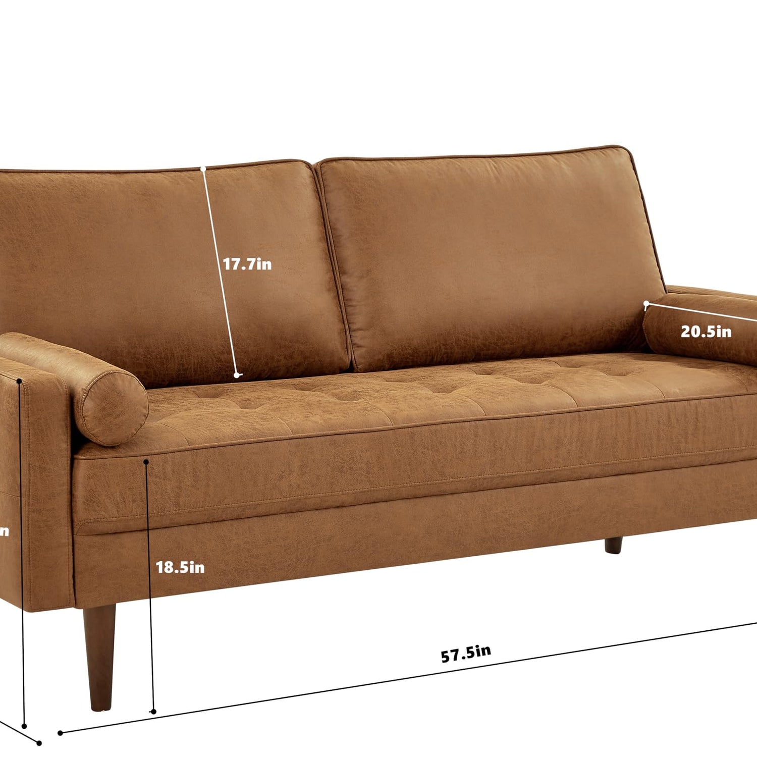 HIFIT 58" Loveseat Sofa Couch, Mid Century Modern Faux Leather Couch with Hand-Sewn Deep Love Seat & 2Pillows, Home Sofa Living Room Small Couches for Small Space,Bedroom,Office,Solid Wood Frame,Brown