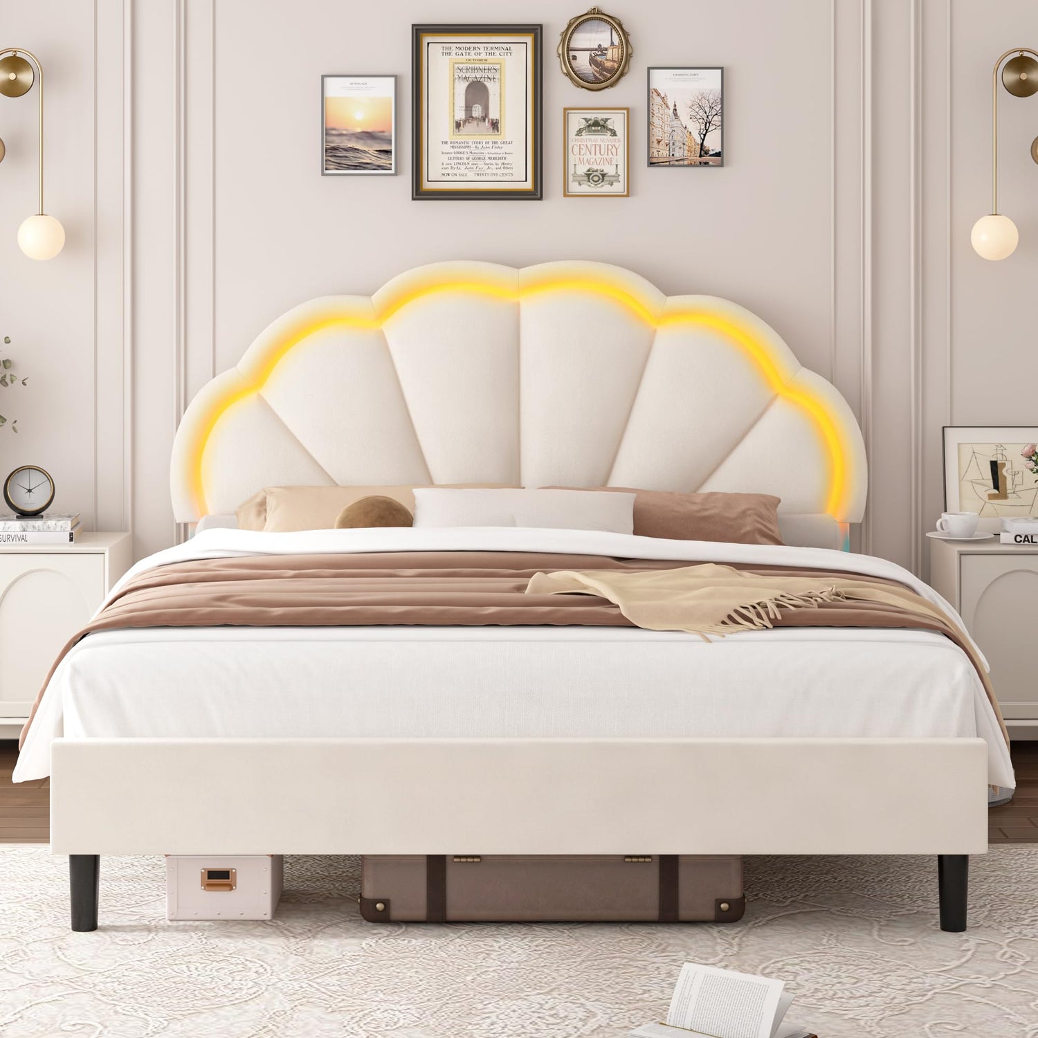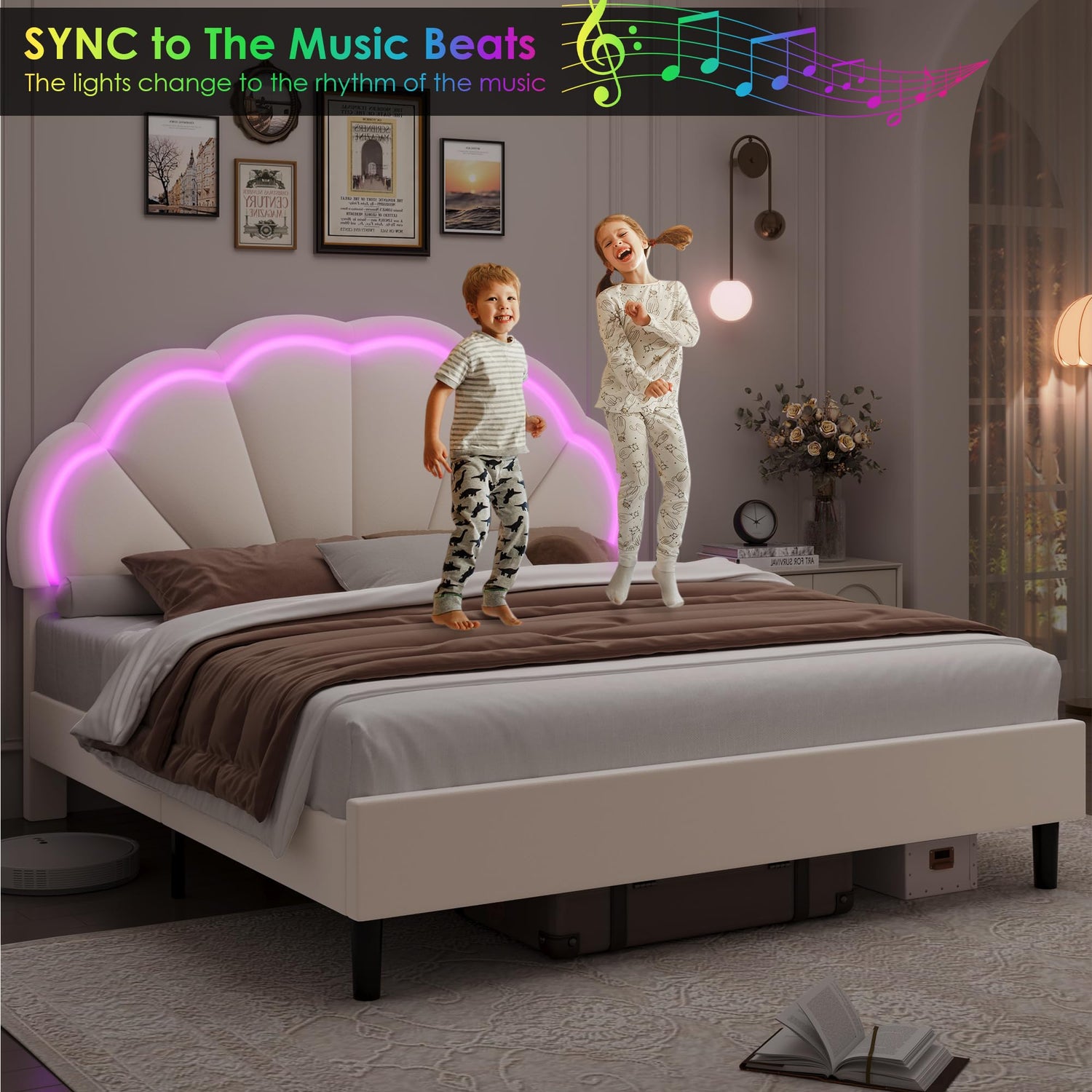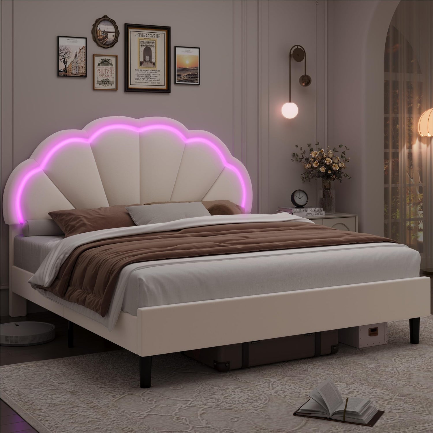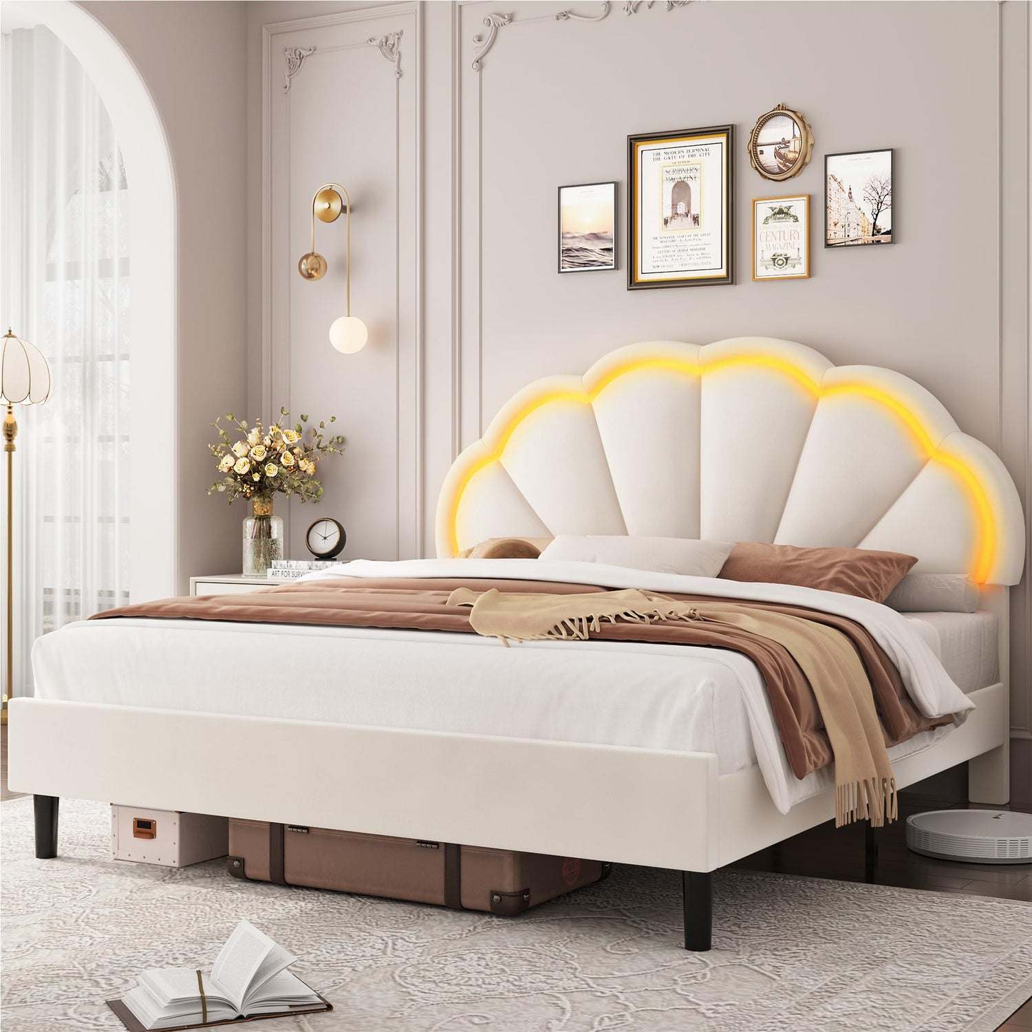 HIFIT King Size Upholstered LED Bed Frame with Adjustable Elegant Flowers Headboard in Beige