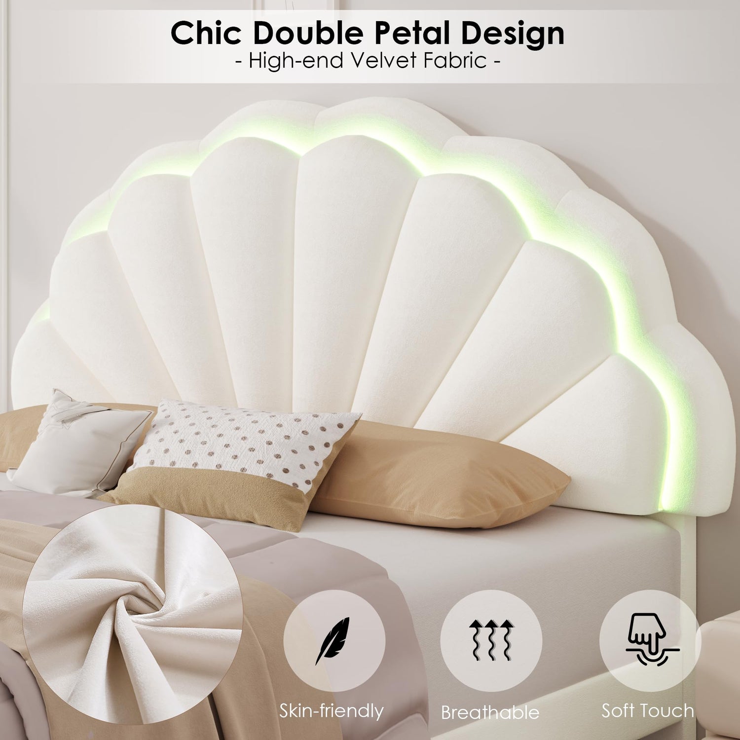 The beautifully designed double petal headboard is not only chic but also incorporates an adjustable height feature, ranging from 45 to 48 inches. Upholstered in skin-friendly beige velvet and padded with soft sponge, it adds a touch of timeless elegance while providing the support needed for those cozy reading sessions or late-night TV binges.
