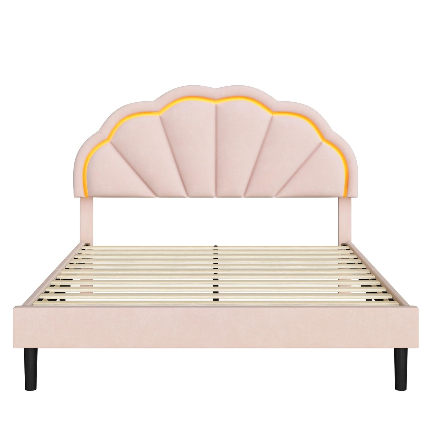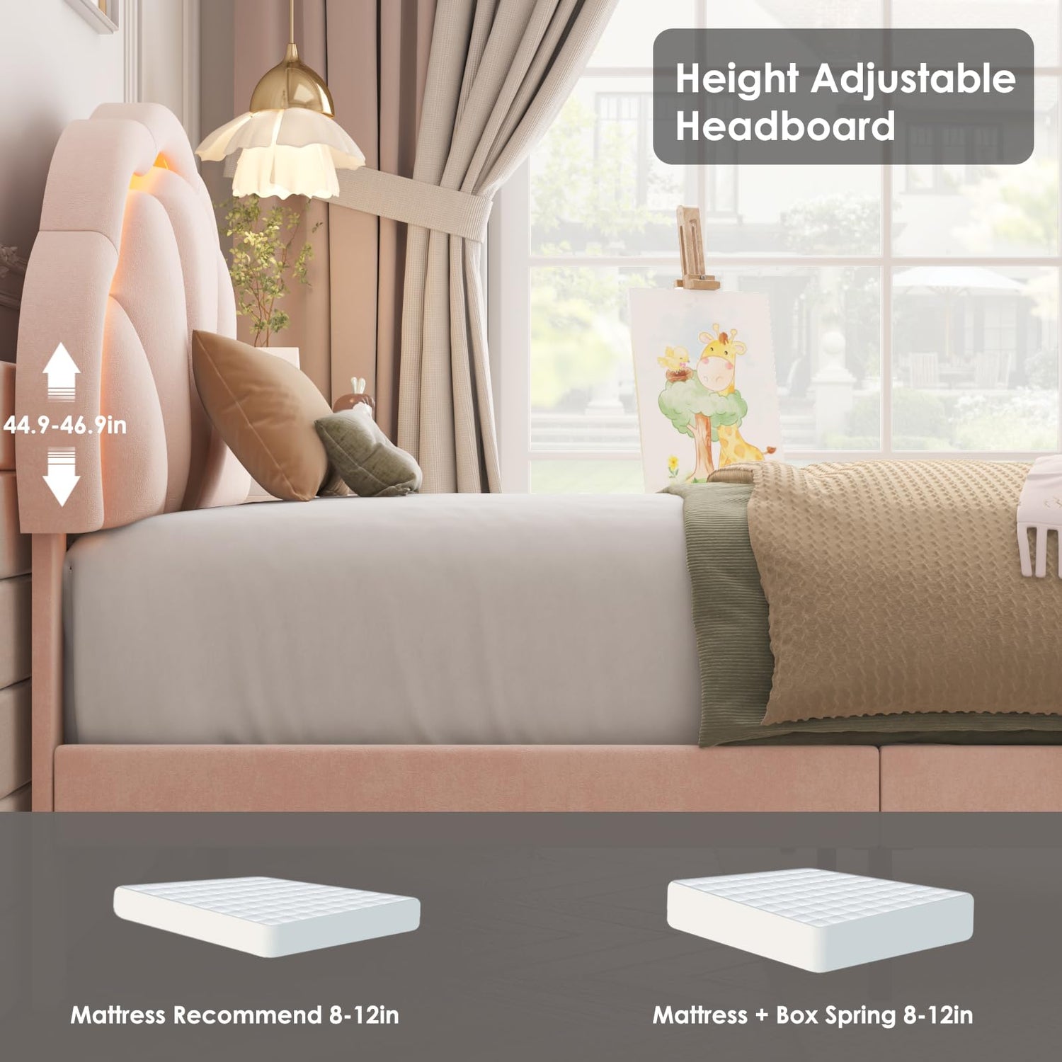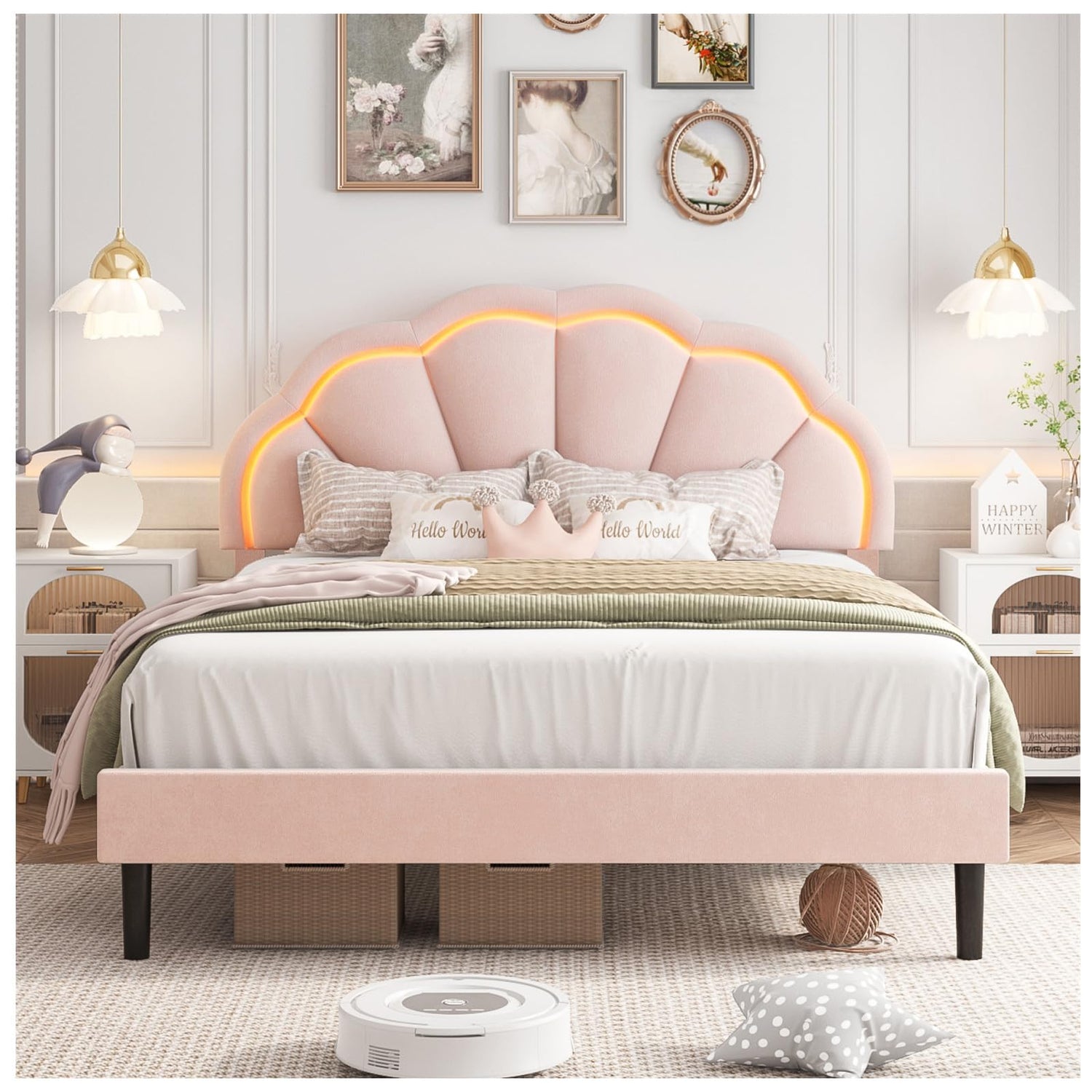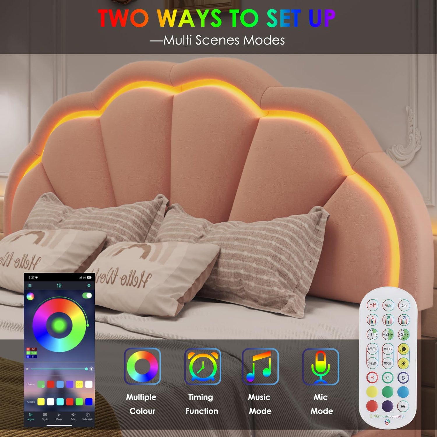 HIFIT Queen Upholstered Smart LED Bed Frame with Adjustable Chic Petal Headboard, Soft Princess Queen Size Platform Bed Frame for Girls, Wooden Slats Support, No Box Spring Needed, Easy Assembly, Pink