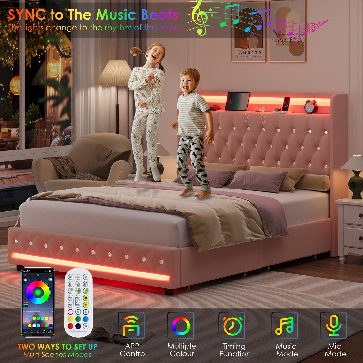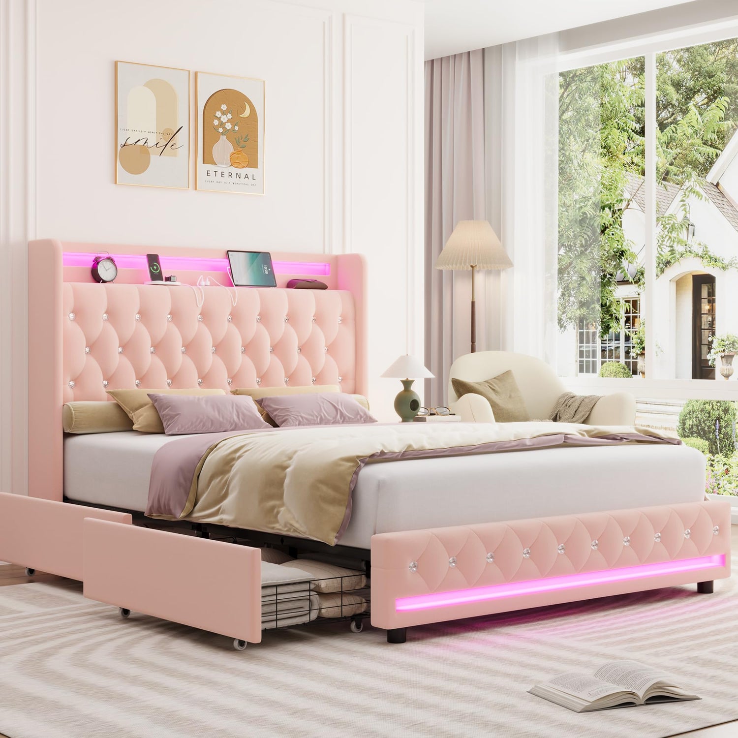 HIFIT Upholstered Full Size LED Bed Frame with Charging Station & 4 Storage Drawers, Velvet Crystal Button-Tufted Wingback Headboard, Princess Platform Bed Frames for Girls, No Box Spring Needed, Pink