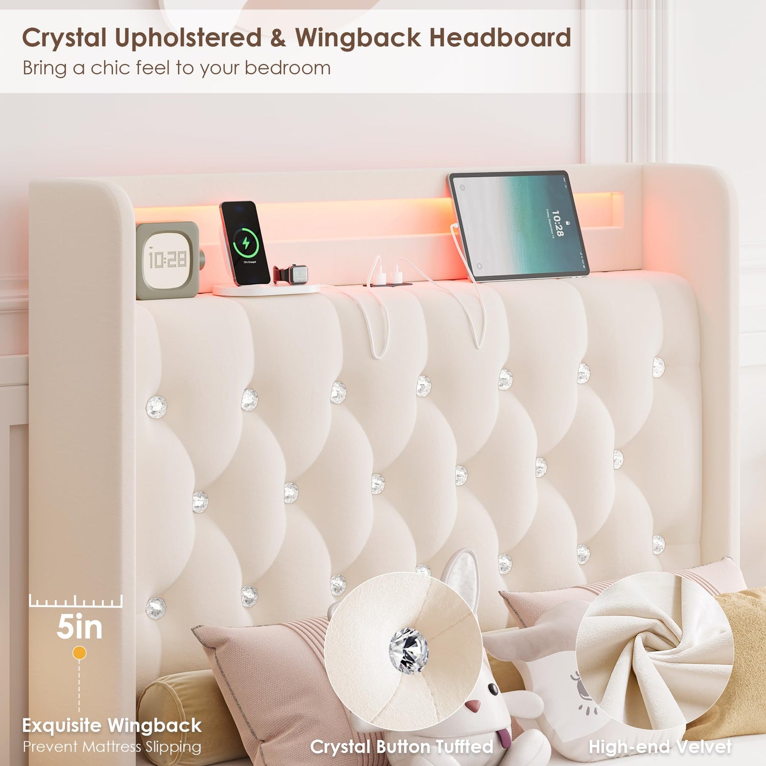 - IDEAL BED CHOICE FOR EVERY GIRL'S BEDROOM: We believe that every girl deserves a magical and cozy bed where she can feels safe, relaxed, and inspired. The HIFIT LED bed frame with storage, featuring a crystal tufted wingback headboard, is the perfect choice. The sparkling crystal button headboard is adorned with colorful LED light that are customizable in colors and modes for a personalized bedroom ambiance. Plus, with its versatile storage design and built-in charging station, this twin size bed frames combines practicality with convenience, making it an ideal choice for a chic girls bedroom or guest room